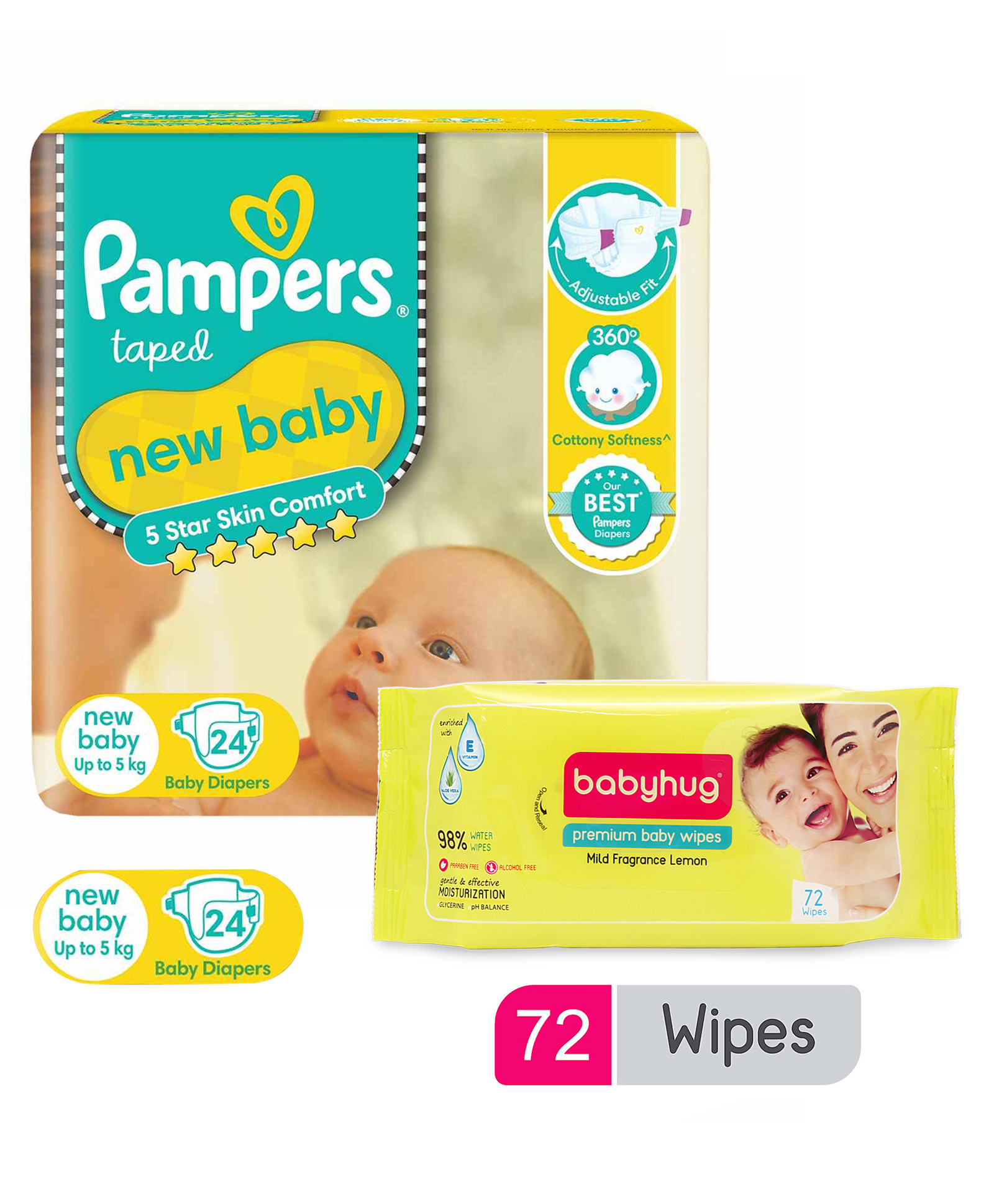 Pampers New Baby Diapers New Born - 24 Pieces & Babyhug Premium Baby Lemon Wipes - 72 Pieces