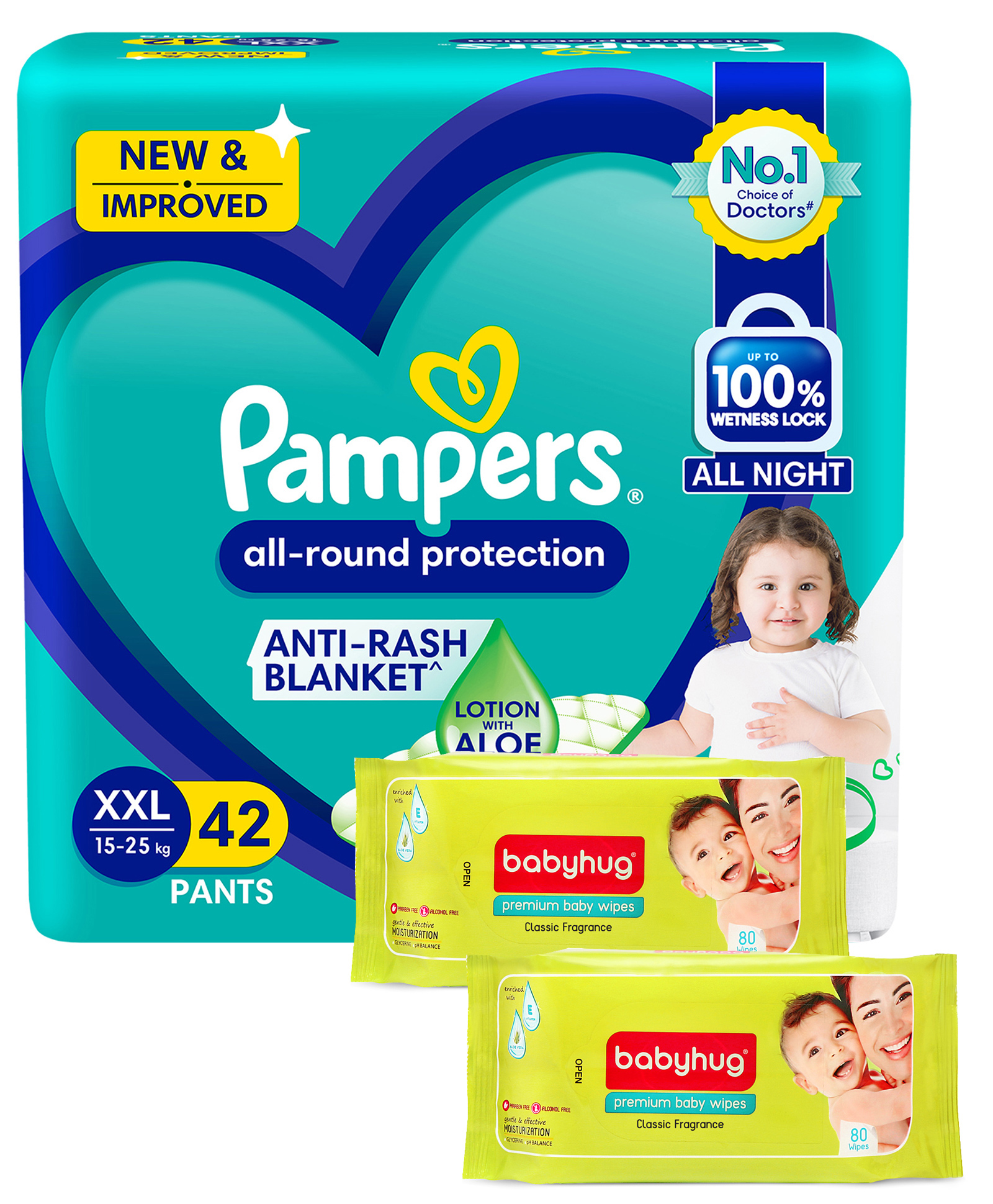 Pampers All round Protection Pants, Double Extra Large size (XXL) 42 Count, Anti Rash diapers, Lotion with Aloe Vera & Babyhug Premium Baby Lemon Wipes - 72 Pieces - (Pack of 2)