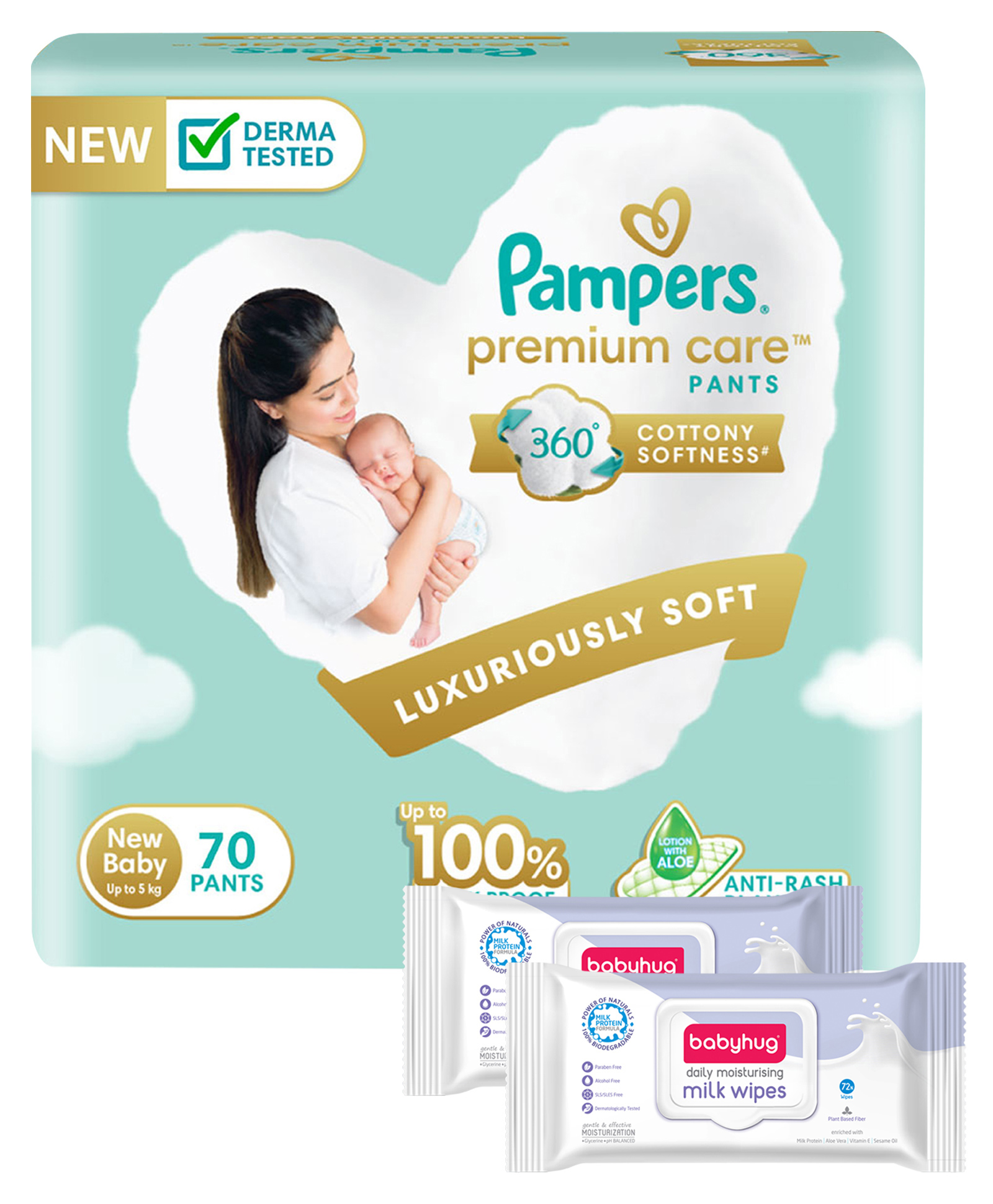 Pampers Premium Care Pants, New Born, Extra Small size baby diapers (NB,XS), 70 count, Softest ever Pampers & Babyhug Daily Moisturising Milk Wipes - 72 Pieces - (Pack of 2)