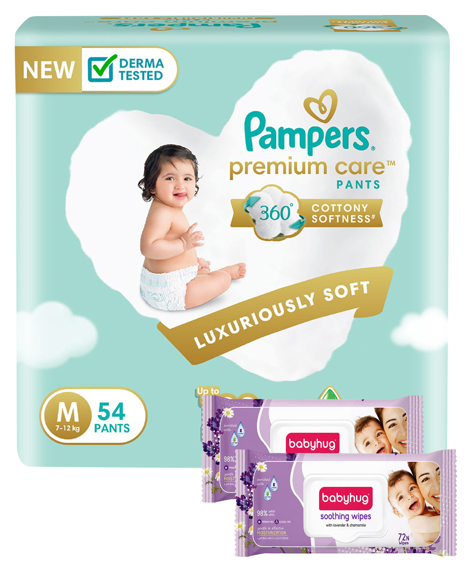 Pampers Premium Care Pants, Medium size baby diapers (MD), 54 Count, Softest ever Pampers pants & Babyhug Soothing Lavender & Chamomile Wipes - 72 Pieces - (Pack of 2)