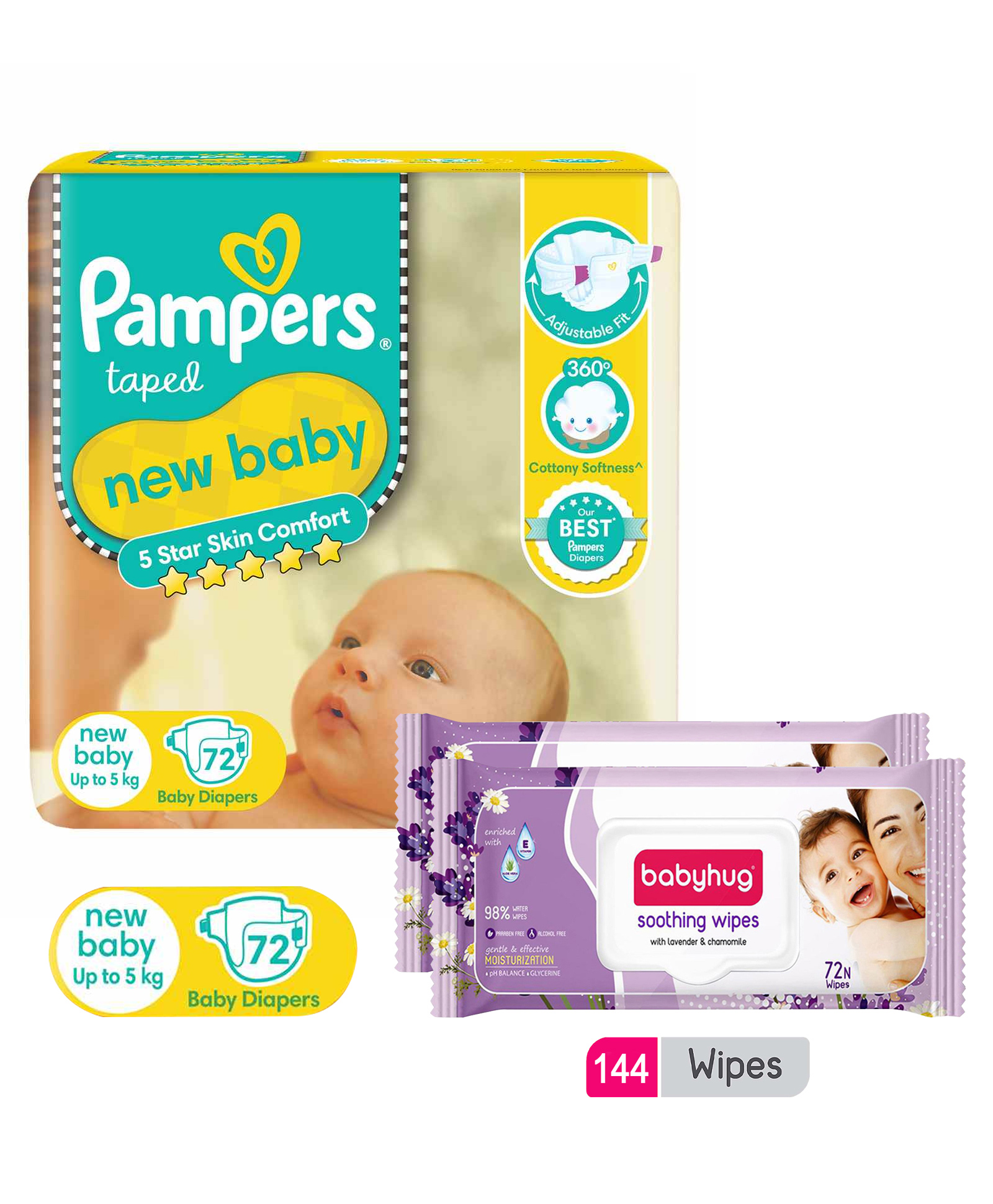 Pampers Active Baby Diapers, New Born, Extra Small, (NB, XS) size, 72 Count, Taped style diaper & Babyhug Soothing Lavender & Chamomile Wipes - 72 Pieces - (Pack of 2)