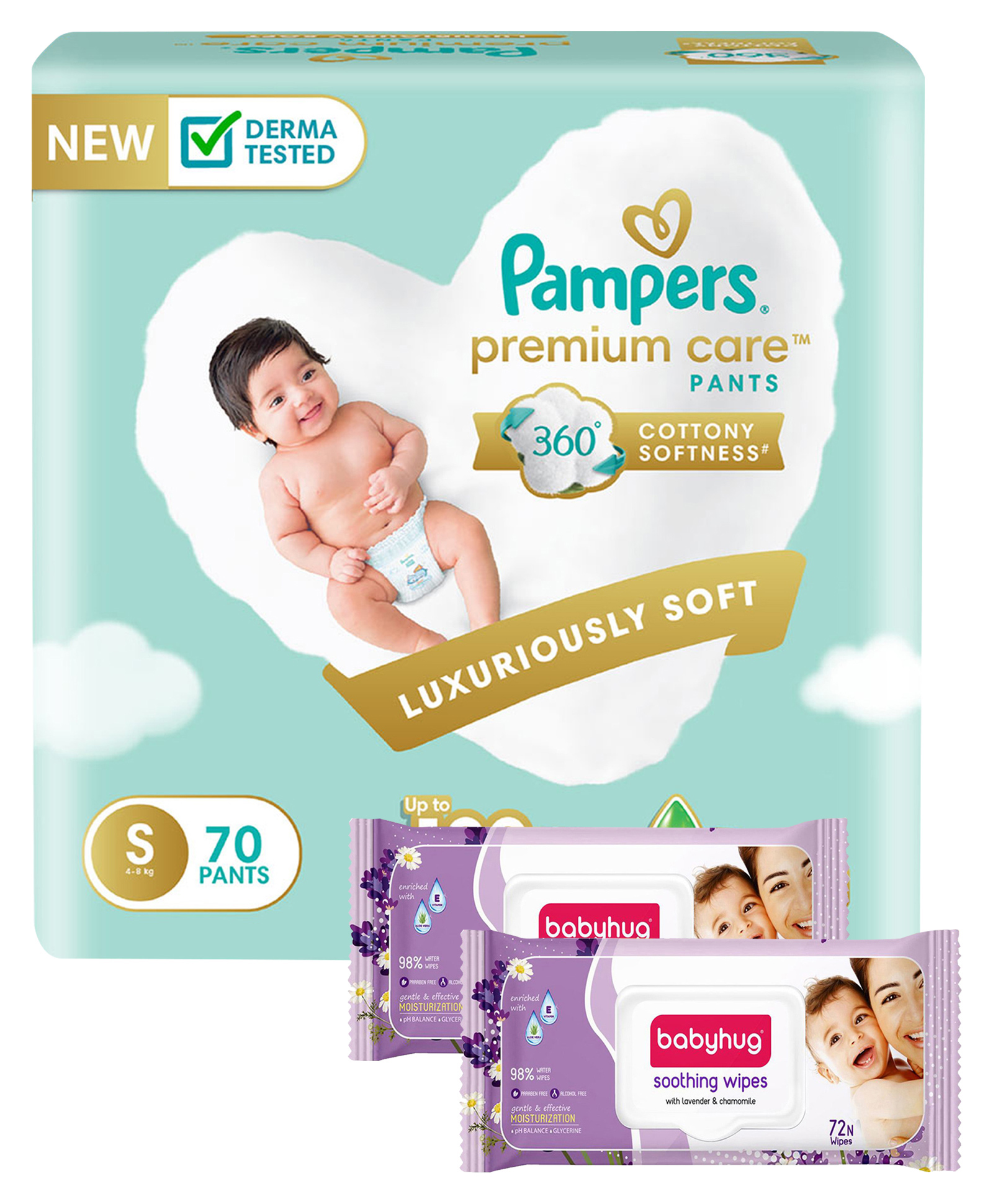 Pampers Premium Care Pants, Small size baby diapers (SM), 70 Count, Softest ever Pampers pants & Babyhug Soothing Lavender & Chamomile Wipes - 72 Pieces - (Pack of 2)