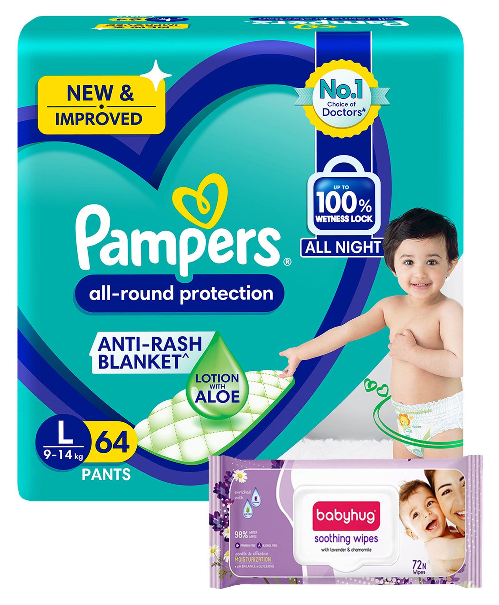 Pampers All round Protection Pants, Large size (LG) 64 Count, Anti Rash diapers, Lotion with Aloe Vera & Babyhug Soothing Lavender & Chamomile Wipes - 72 Pieces - (Pack of 2)