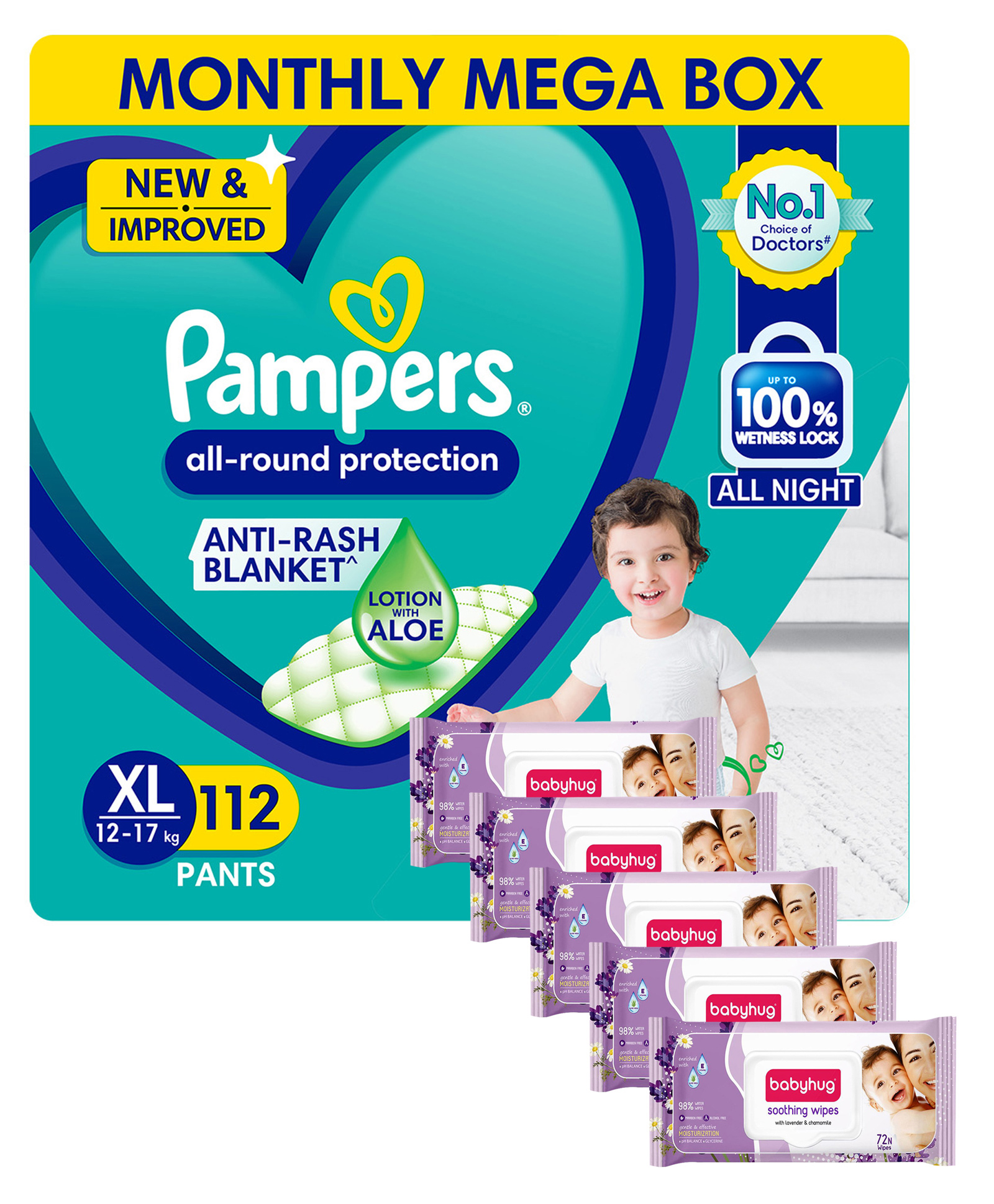 Pampers All round Protection Pants, Extra Large size (XL) 112 Count, Anti Rash diapers, Lotion with Aloe Vera & Babyhug Soothing Lavender & Chamomile Wipes - 72 Pieces - (Pack of 4)