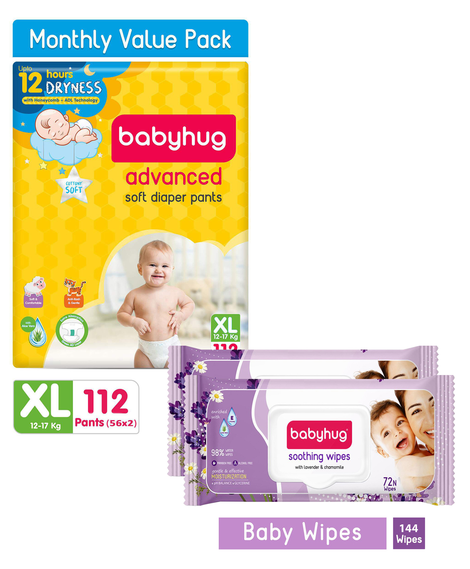 Babyhug Advanced Pant Style Diapers Extra Large Monthly Box Pack - 112 Pieces & Babyhug Soothing Lavender & Chamomile Wipes - 72 Pieces (Pack of 2)
