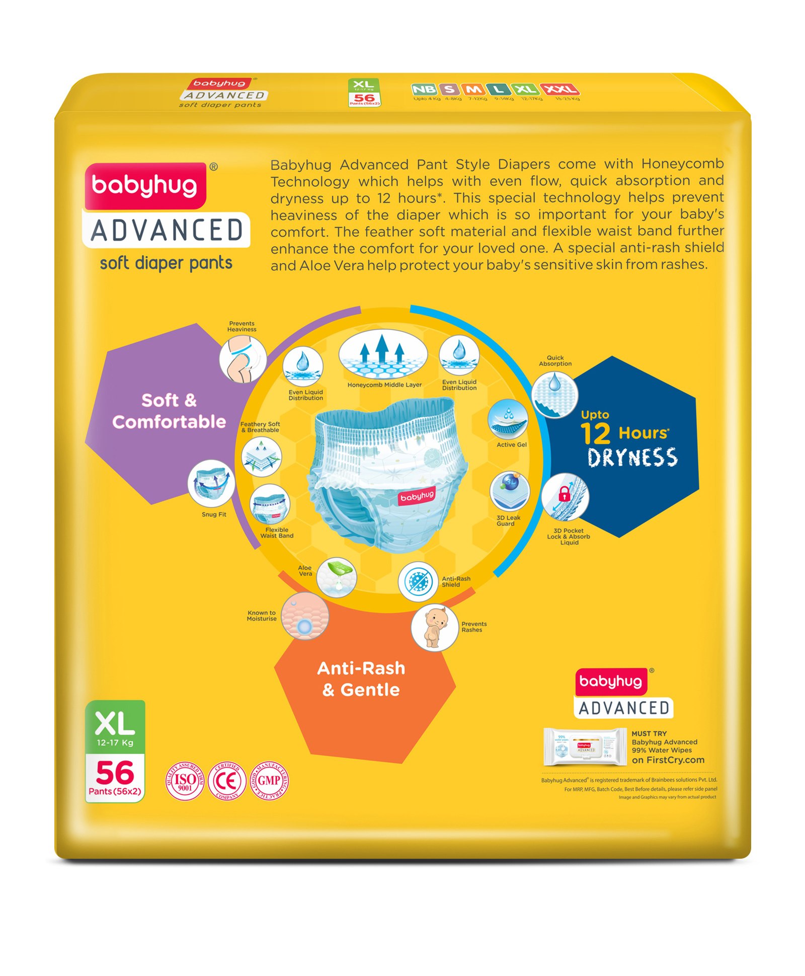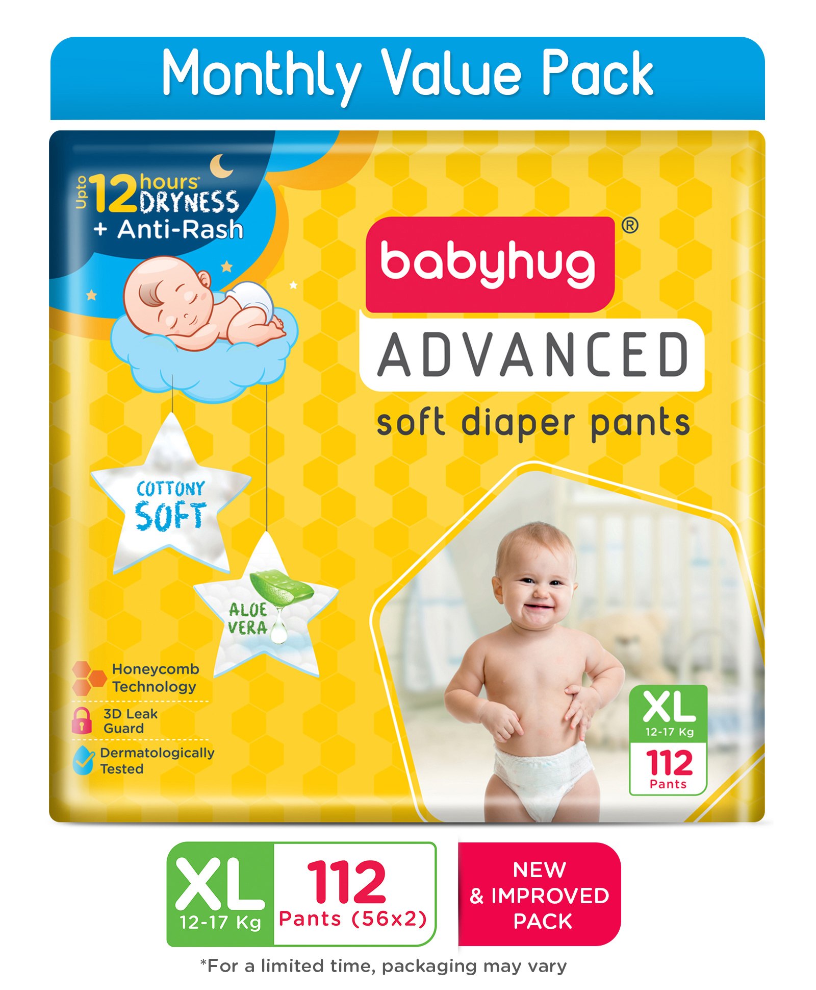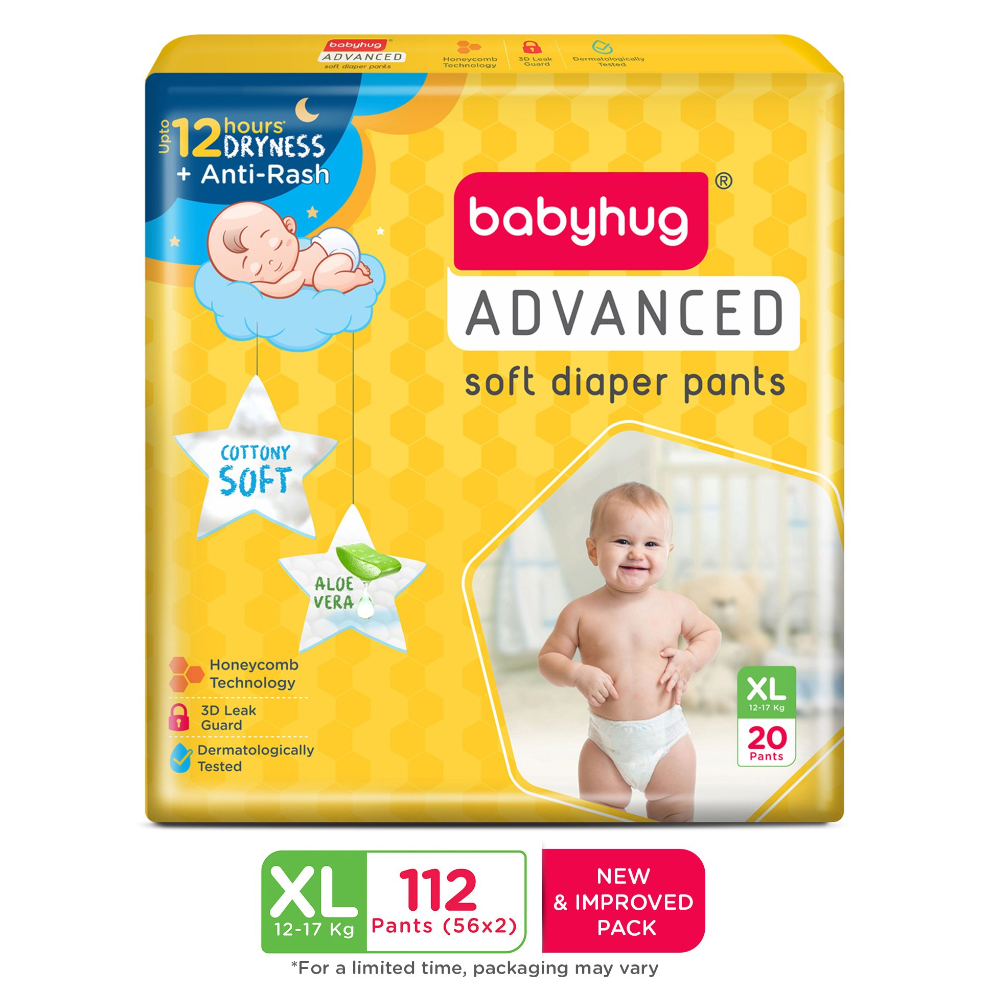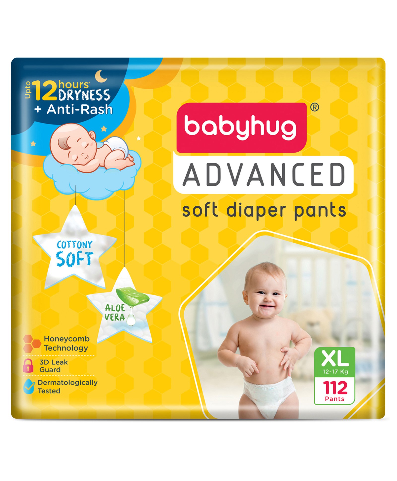 Babyhug Advanced Pant Style Diapers Extra Large (XL) Size Monthly Box Pack - 112 Pieces, Honeycomb Technology, Cottony Soft Diaper with 3D Leak Guard, Latex & Alcohol Free, Anti-rash & Gentle