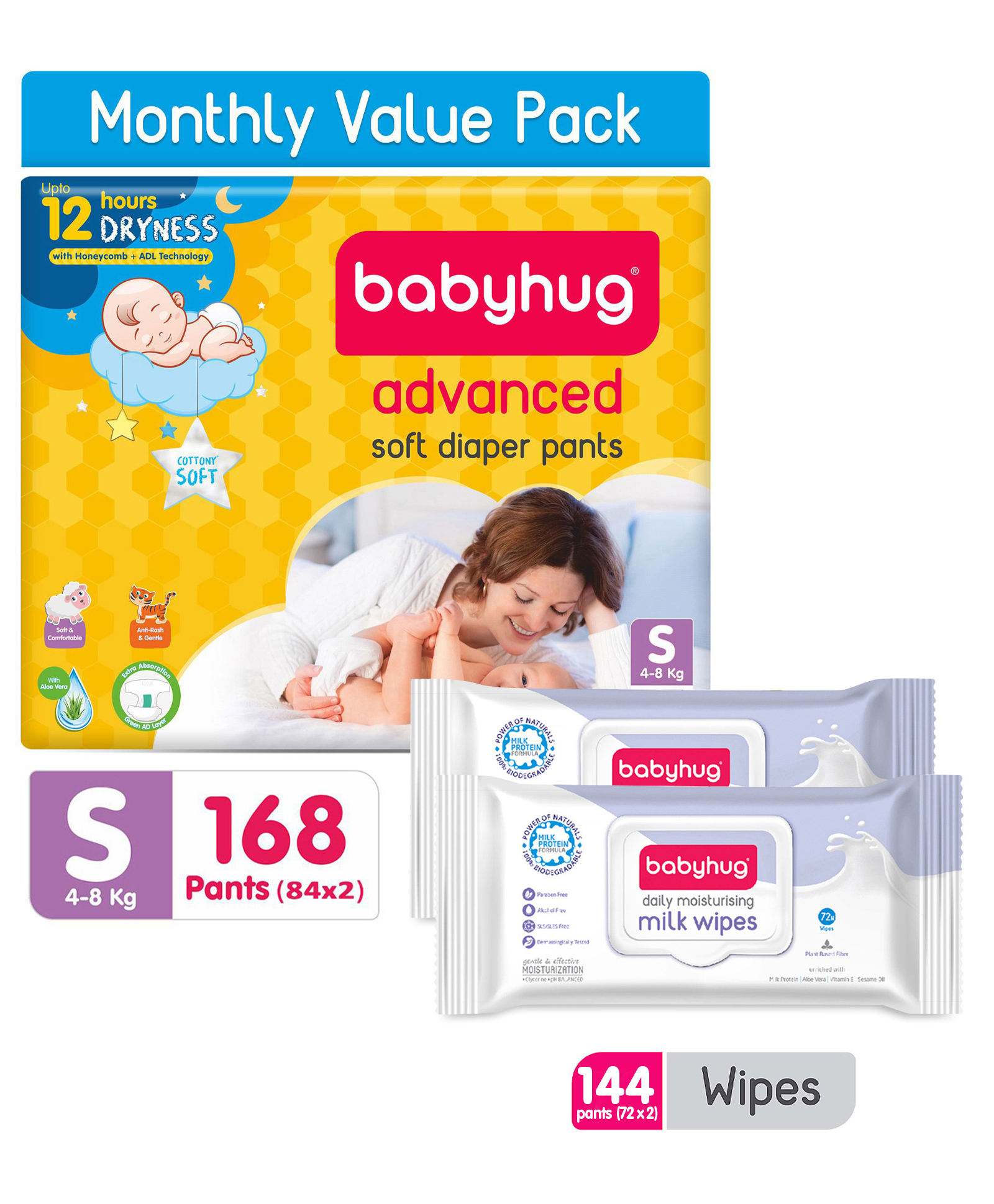 Babyhug Advanced Pant Style Diaper Monthly Box Pack Small - 168 Piecess & Babyhug Daily Moisturising Milk Wipes - 72 Pieces (Pack of 2)