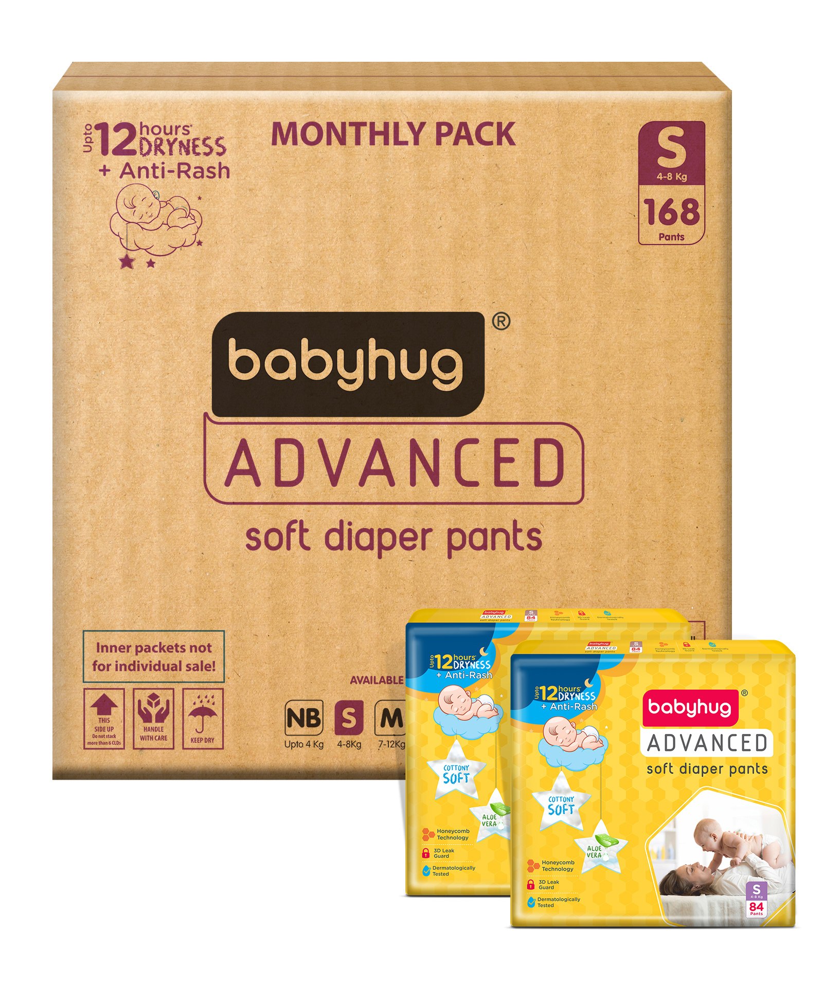Babyhug Advanced Pant Style Diaper Monthly Box Pack Small (S) Size - 168 Pieces, Honeycomb Technology, Cottony Soft Diaper with 3D Leak Guard, Latex & Alcohol Free, Anti-rash & Gentle