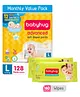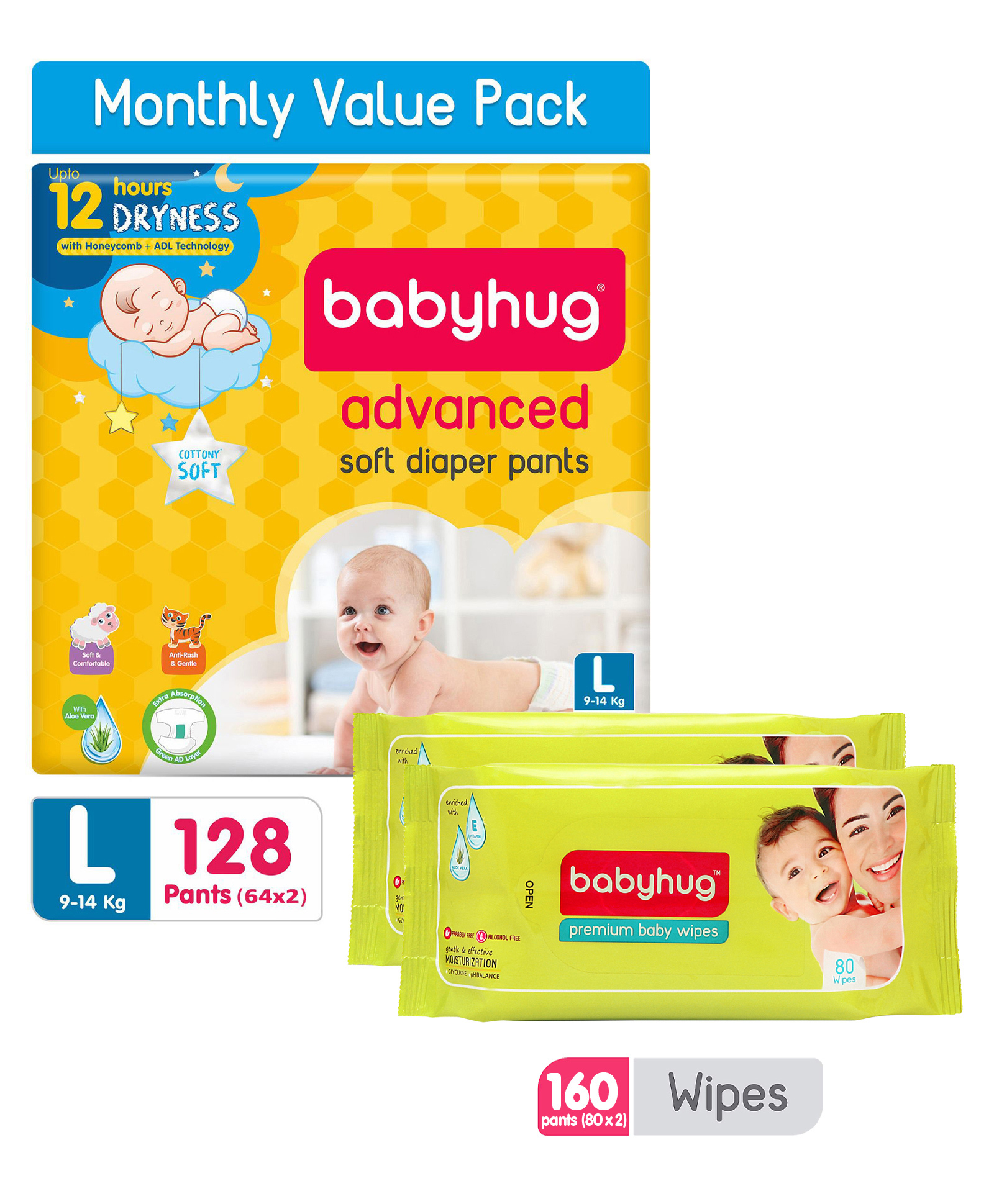 Babyhug Advanced Pant Style Diapers Large - 128 Pieces & Babyhug Premium 98% Water Baby Wet Wipes - 80 Pieces (Pack of 2)