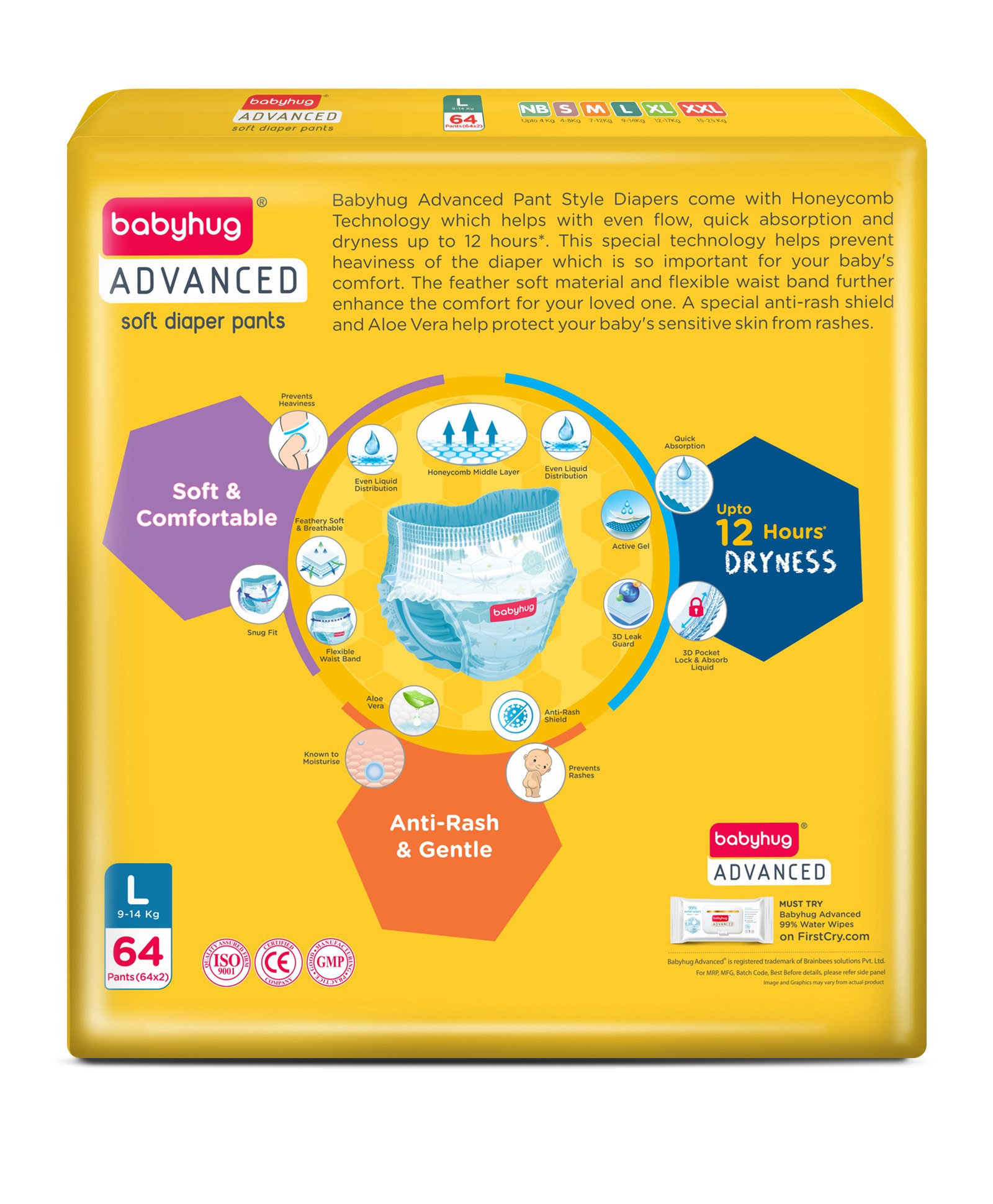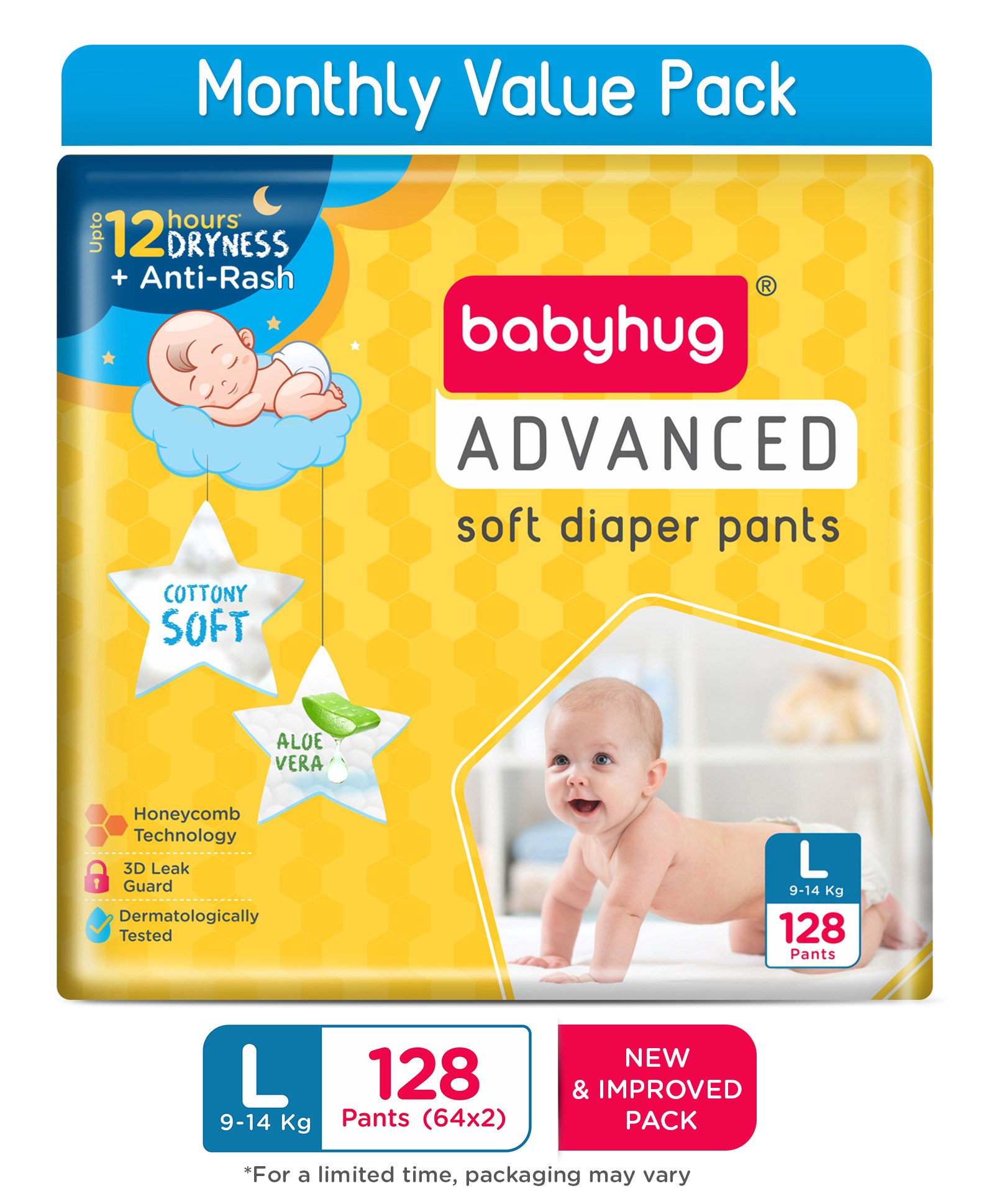 Babyhug Advanced Pant Style Diapers Large (L) Size Monthly Box Pack - 128 Pieces, Honeycomb Technology, Cottony Soft Diaper with 3D Leak Guard, Latex & Alcohol Free, Anti-rash & Gentle