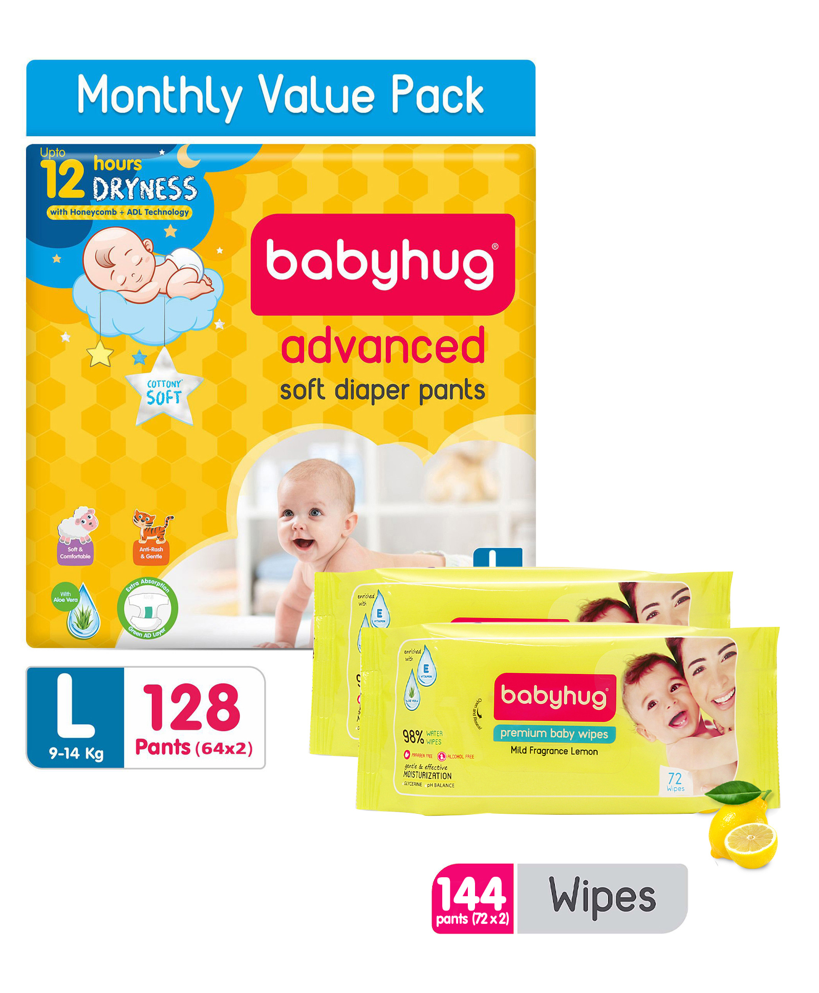 Babyhug Advanced Pant Style Diapers Large Monthly Box Pack - 128 Pieces & Babyhug Premium Baby Lemon Wipes - 72 Pieces (Pack of 2)