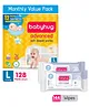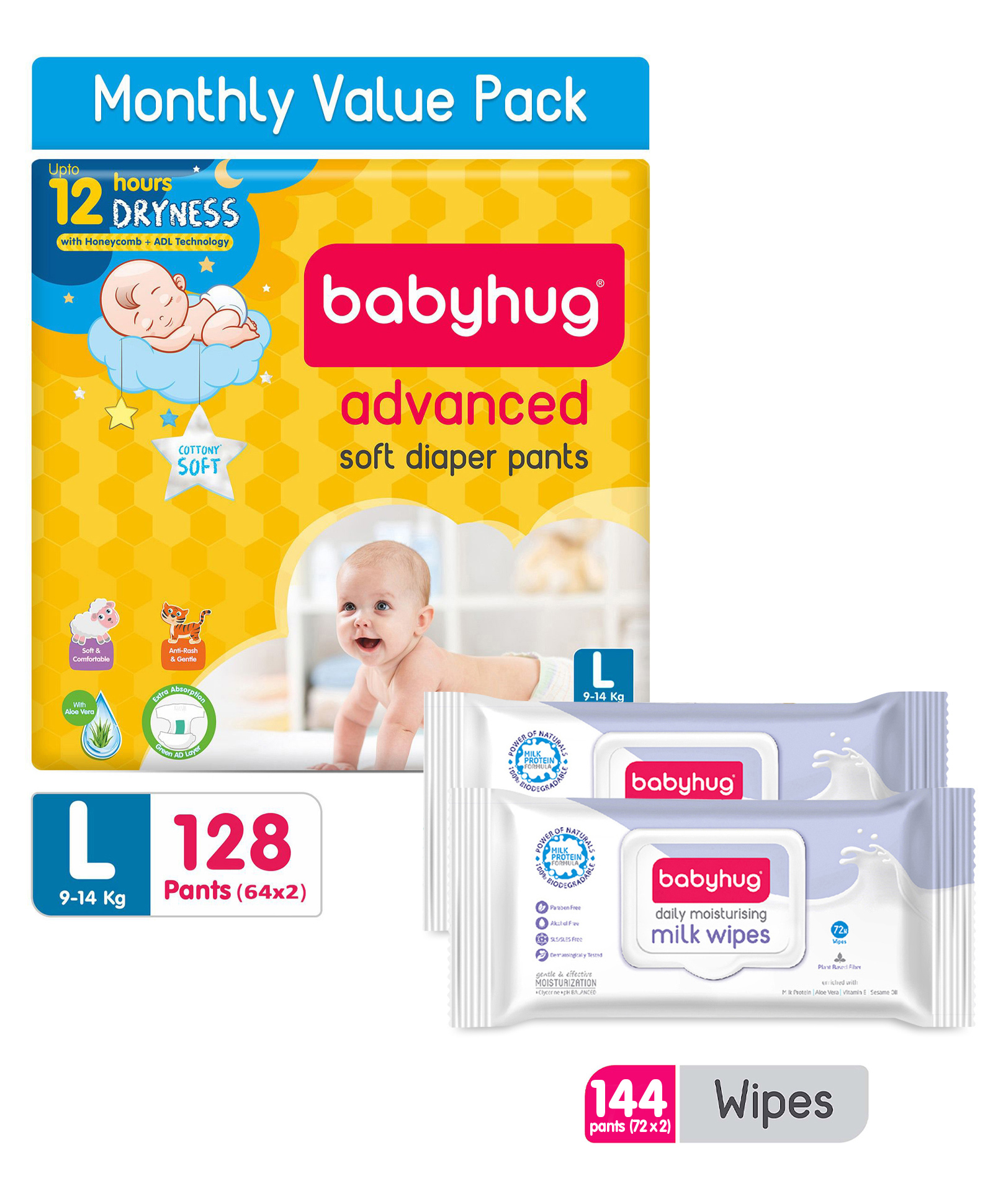 Babyhug Advanced Pant Style Diapers Large Monthly Box Pack - 128 Pieces & Babyhug Daily Moisturising Milk Wipes - 72 Pieces (Pack of 2)