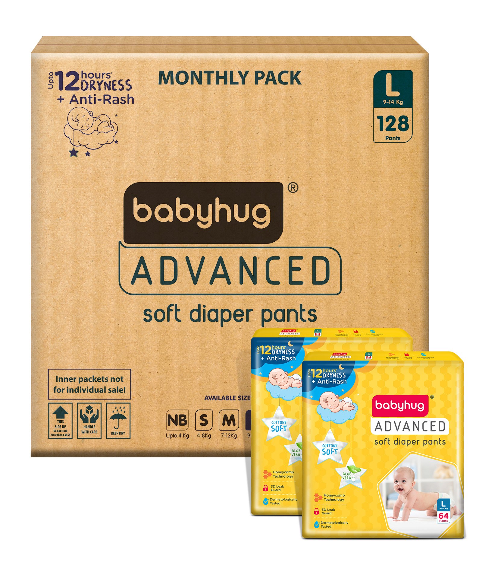 Babyhug Advanced Pant Style Diapers Large (L) Size Monthly Box Pack - 128 Pieces, Honeycomb Technology, Cottony Soft Diaper with 3D Leak Guard, Latex & Alcohol Free, Anti-rash & Gentle