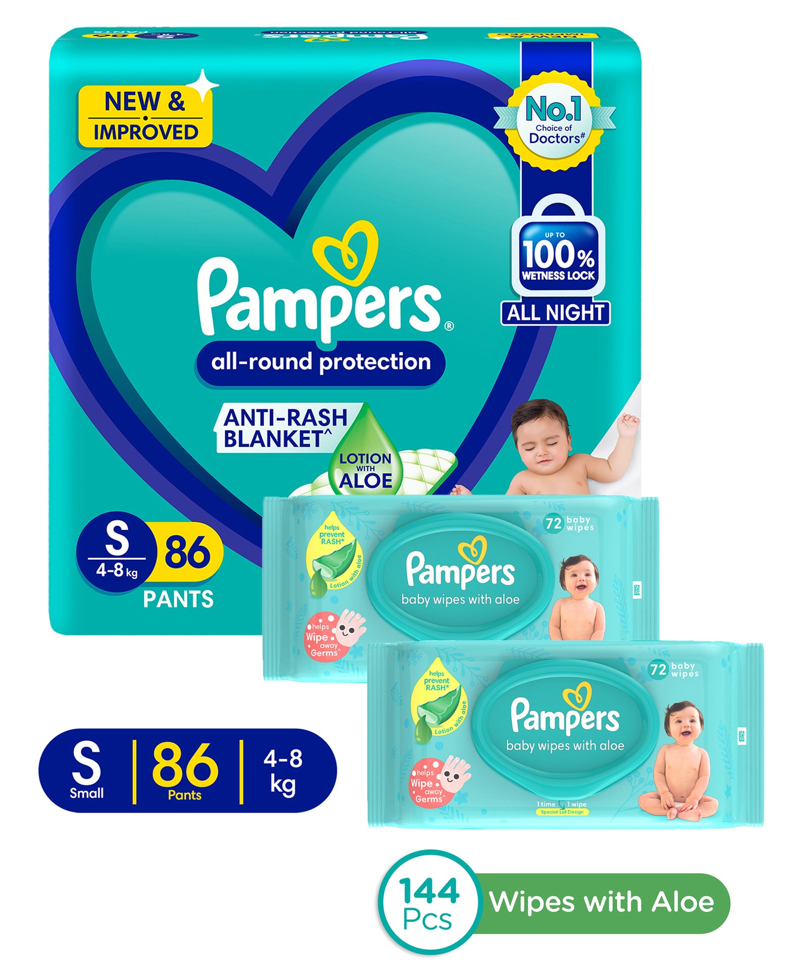 Pampers All round Protection Pants, Small size (SM) 86 Count, Anti Rash diapers, Lotion with Aloe Vera & Pampers Baby Gentle wet wipes with Aloe, 144 count, 97 Pure Water