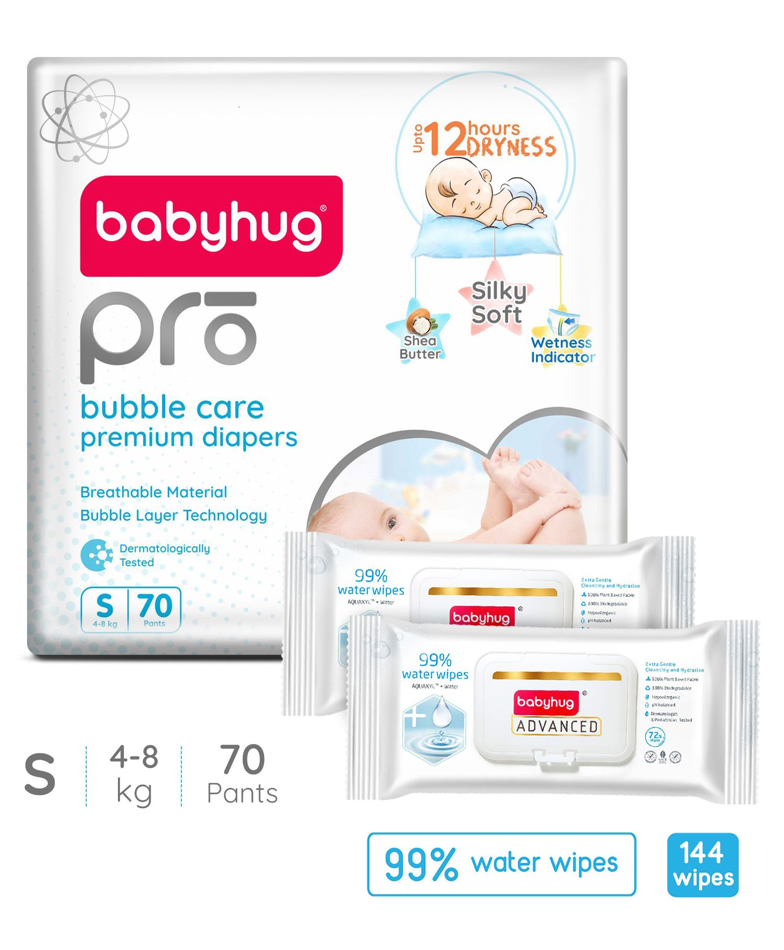 Babyhug Pro Bubble care premium Pant Style Diaper Small - 70 Pieces & Babyhug Advanced 99% Water Wipes-72 pieces - (Pack of 2)