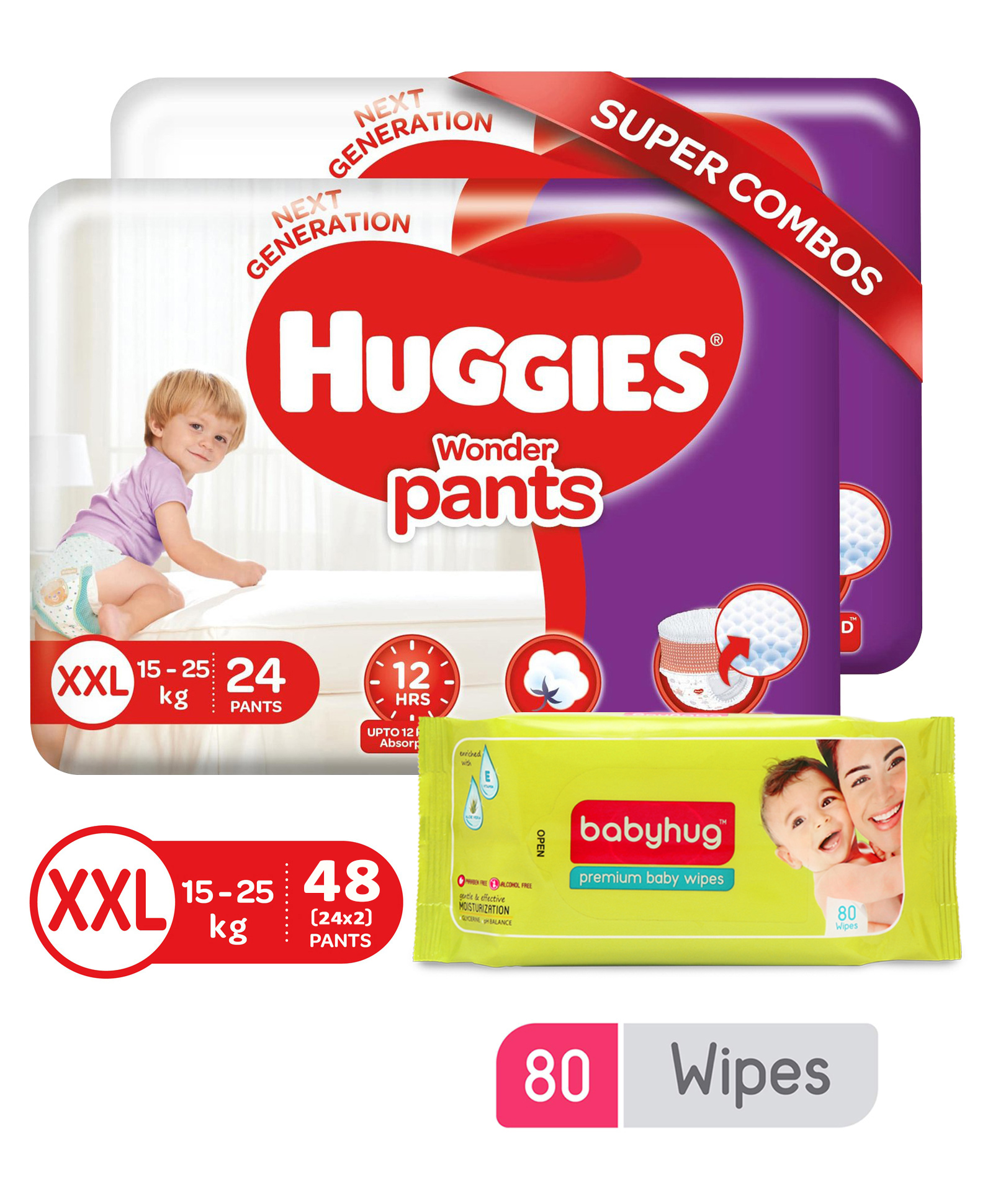 Huggies Wonder Pants XXL Pant Style Diapers - 48 Pieces & Babyhug Premium Baby Wipes - 80 Pieces