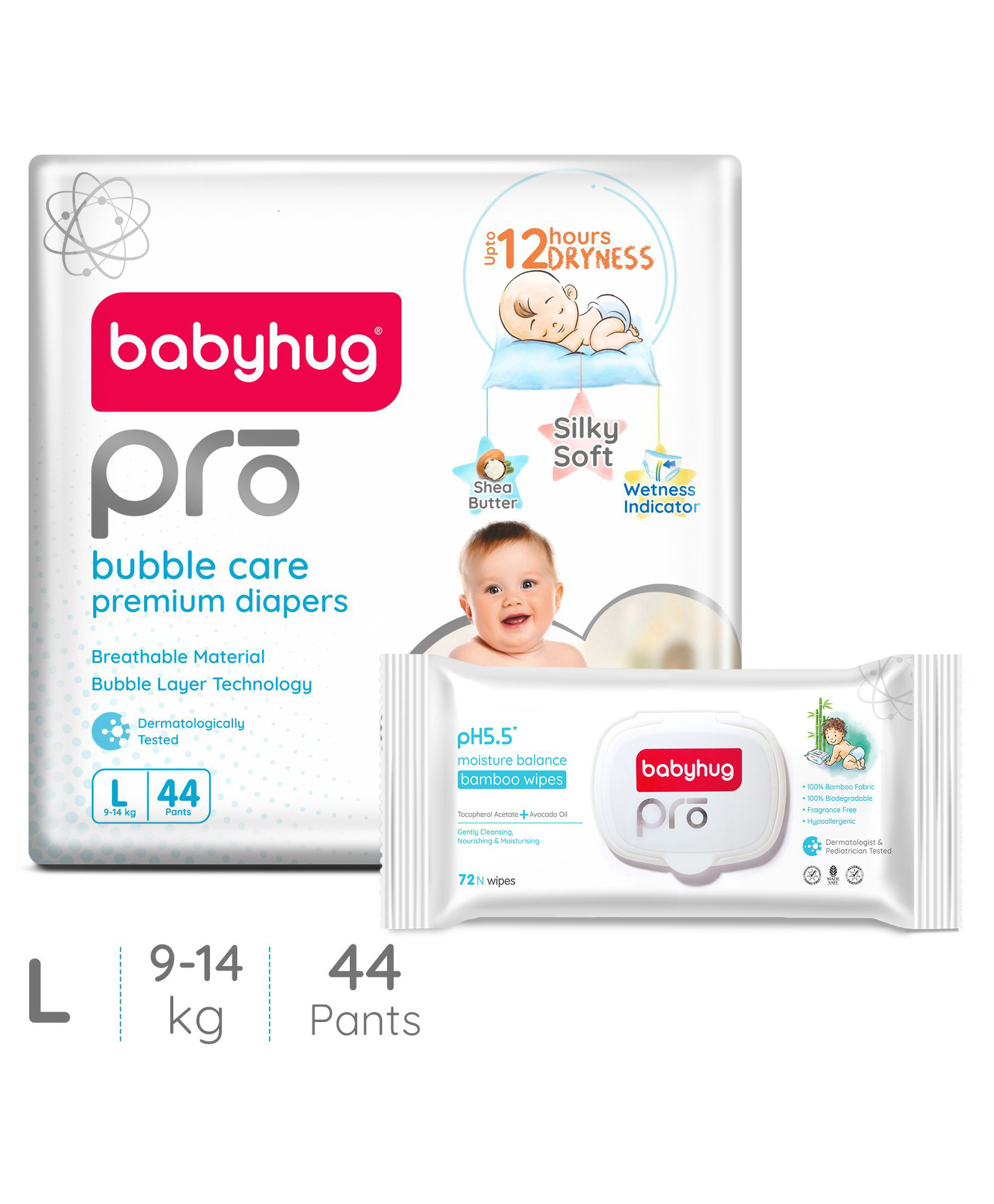 Babyhug Pro Bubble care premium Pant Style Diaper Large - 44 Pieces & Babyhug Pro pH 55 Moisture Balance Bamboo Wipes - 72 pieces