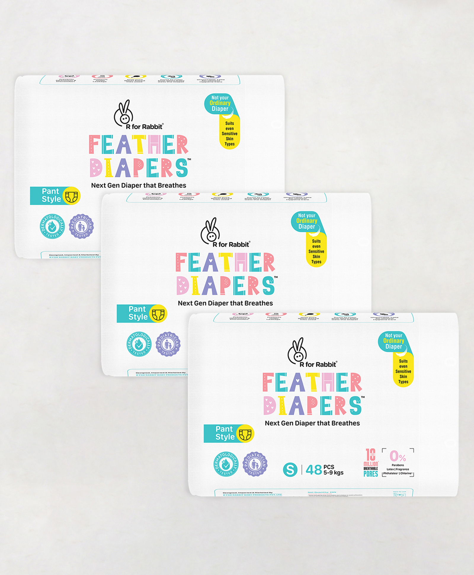 R for Rabbit Feather Diaper Pants Size S-Small for baby of 5-9 kgs - 48 Pieces (Pack of 3)