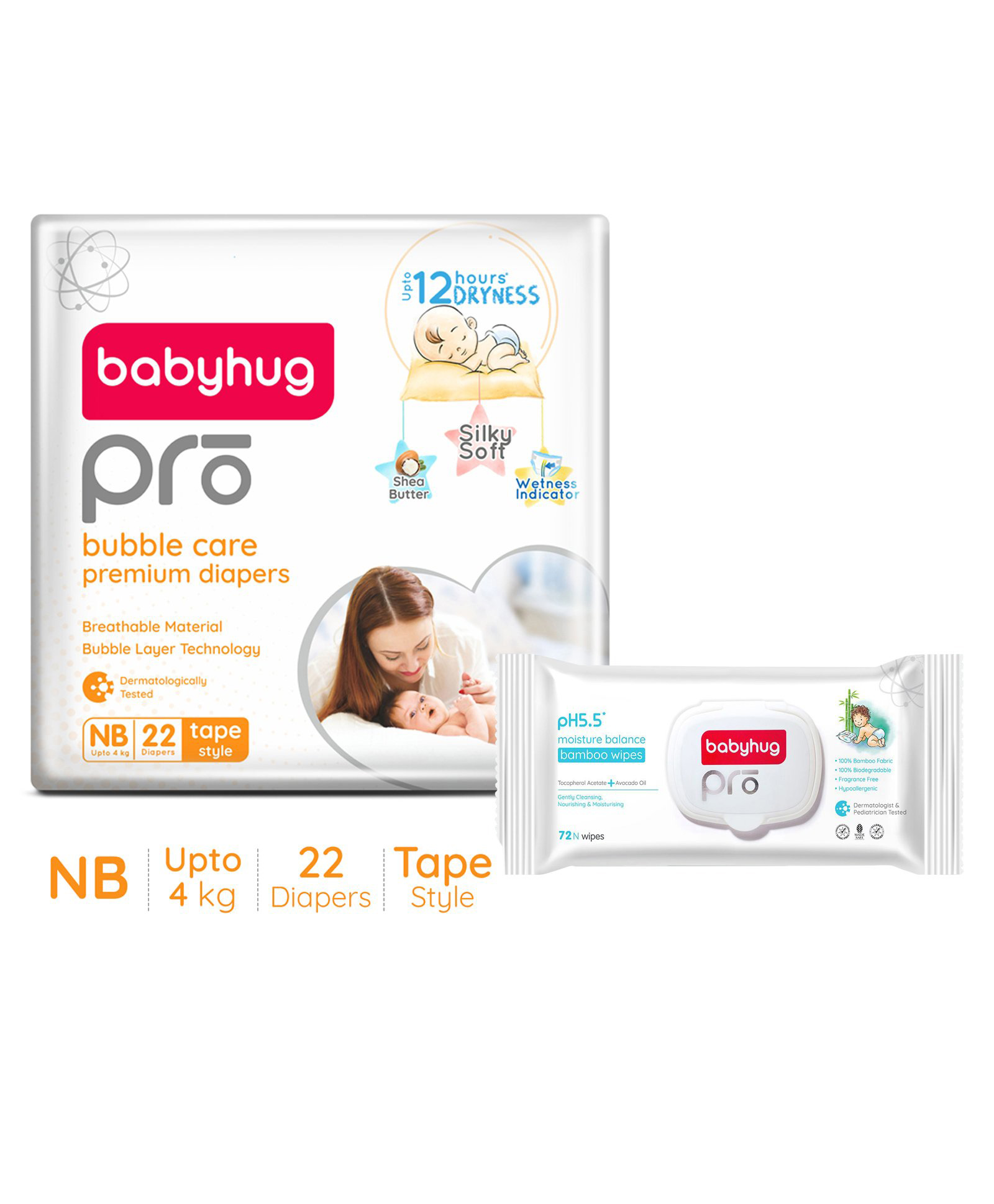 Babyhug Pro Bubble care premium Tape Style Diaper New Born - 22 Pieces & Babyhug Pro pH 55 Moisture Balance Bamboo Wipes - 72 pieces