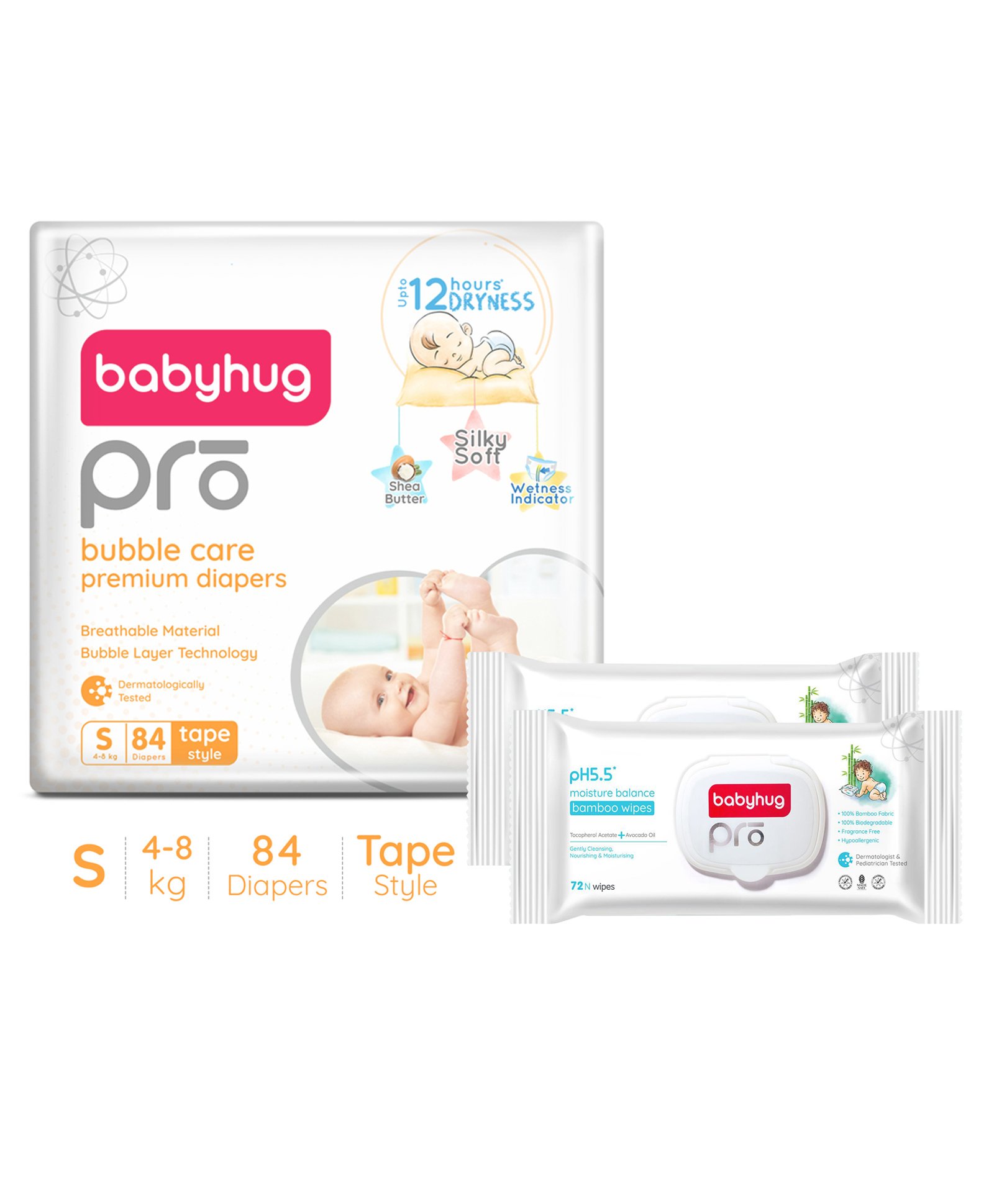 Babyhug Pro Bubble care premium Tape Style Diaper Small - 84 Pieces & Babyhug Pro pH 55 Moisture Balance Bamboo Wipes - 72 pieces -(Pack of 2)