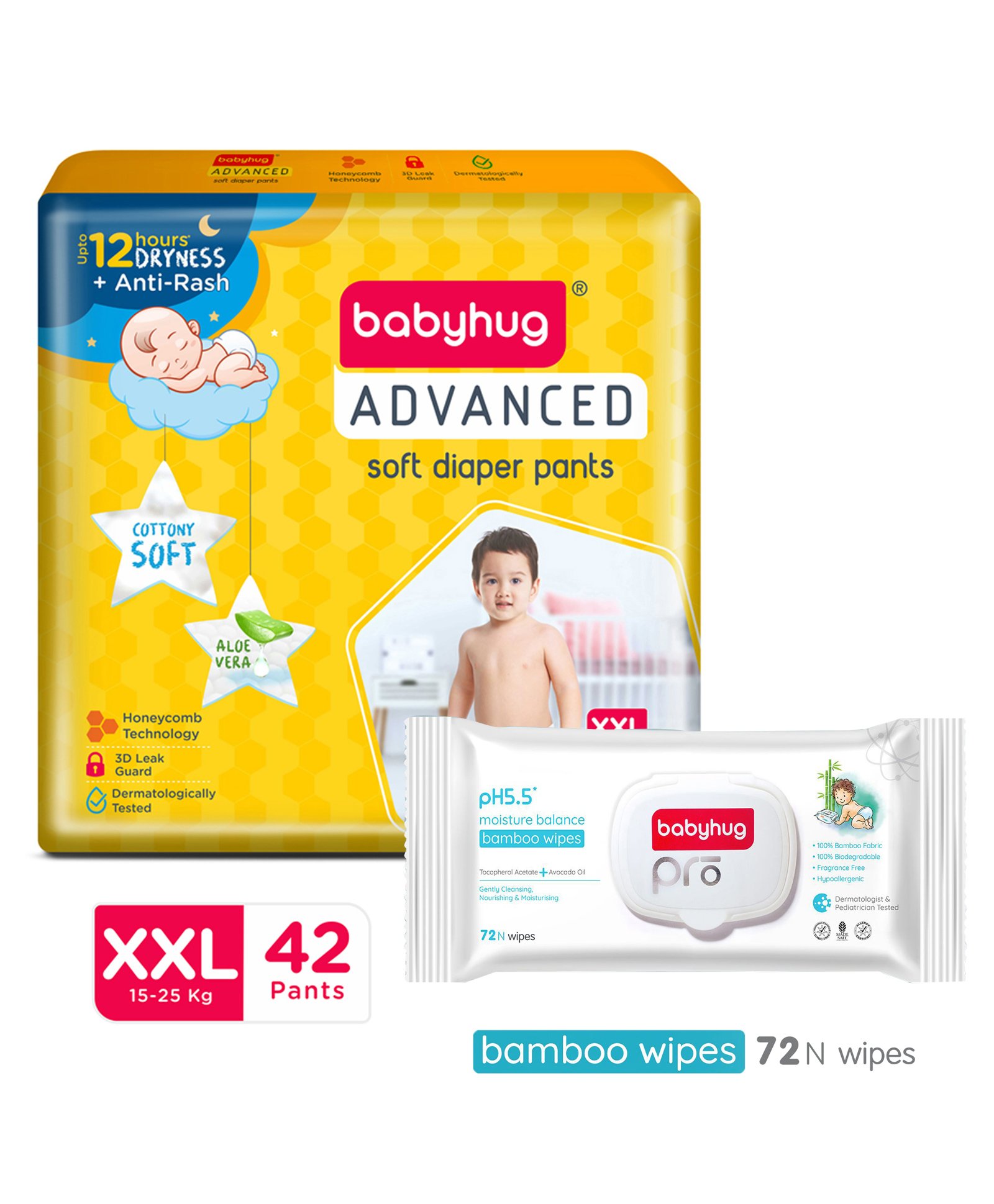 Babyhug Advanced Pant Style Diapers XXL - 42 Pieces & Babyhug Pro pH 55 Moisture Balance Bamboo Wipes - 72 pieces