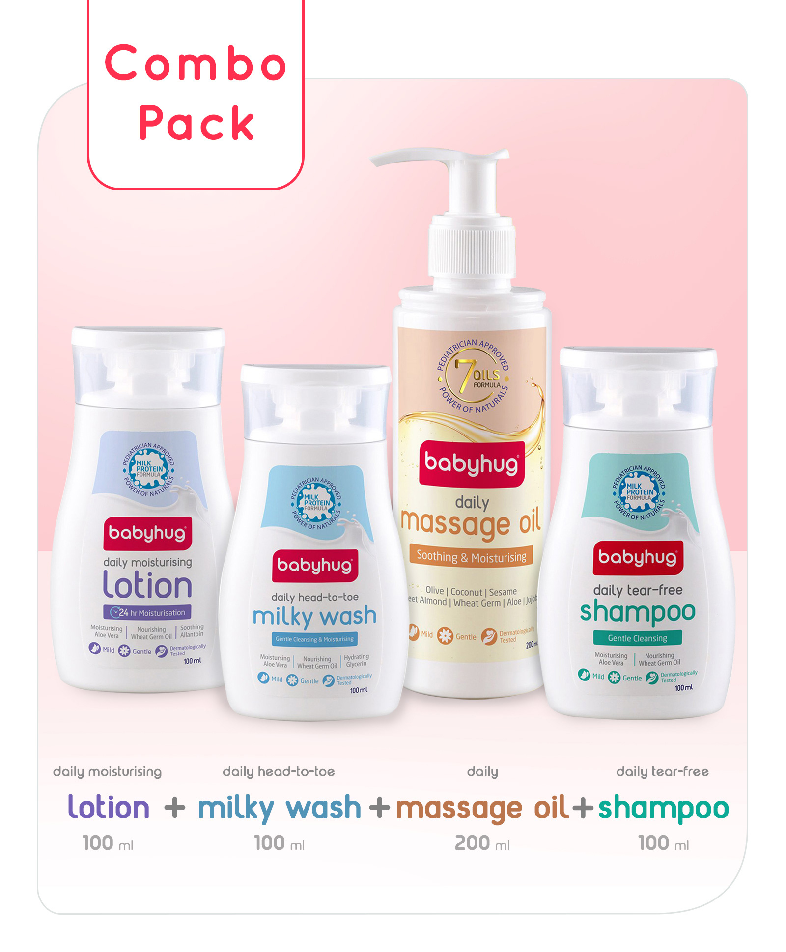Babyhug Daily Massage Oil-200 ml,Wash,Shampoo,Lotion-100 ml Combo (Pack of 4)