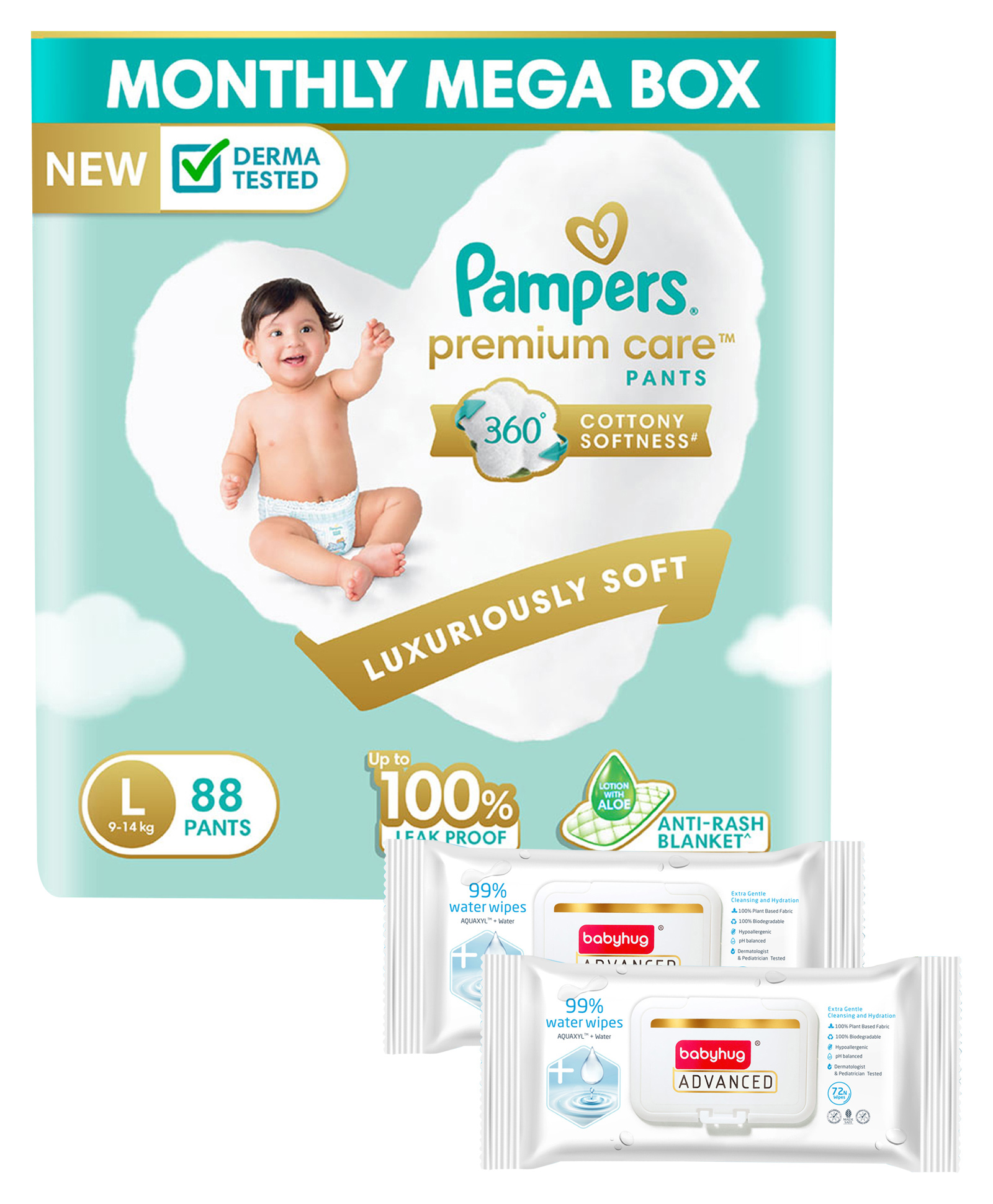Pampers Premium Care Pants, Large size baby diapers (L), 88 Count, Softest ever Pampers pants & Babyhug Advanced 99 Water Wipes - 72 pieces - (Pack of 2)