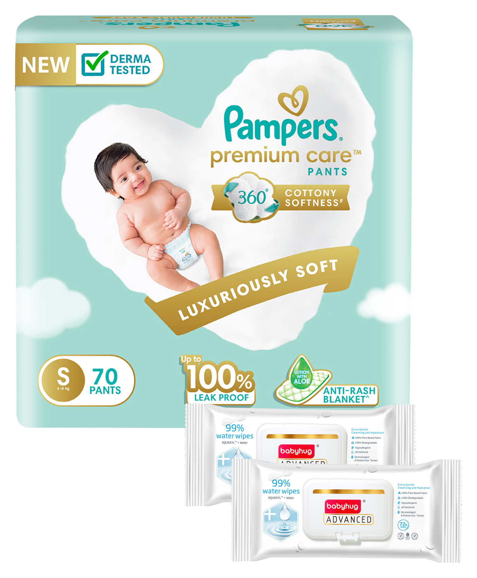 Pampers Premium Care Pants, Small size baby diapers (S), 70 Count, Softest ever Pampers pants & Babyhug Advanced 99 Water Wipes - 72 pieces - (Pack of 2)