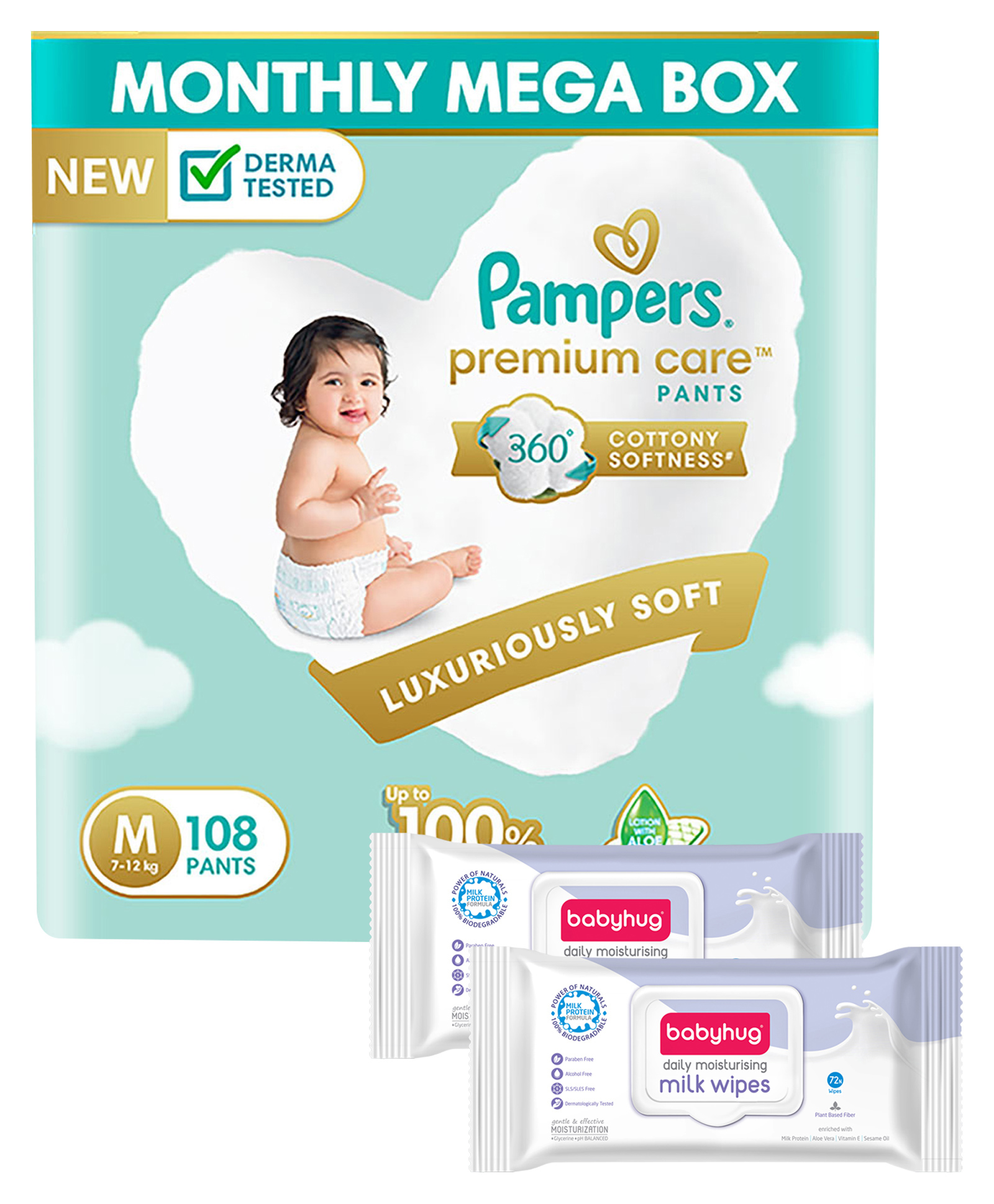 Pampers Premium Care Pants, Medium size baby diapers (M), 108 Count, Softest ever Pampers pants & Babyhug Daily Moisturising Milk Wipes - 24 Pieces - (Pack of 2)
