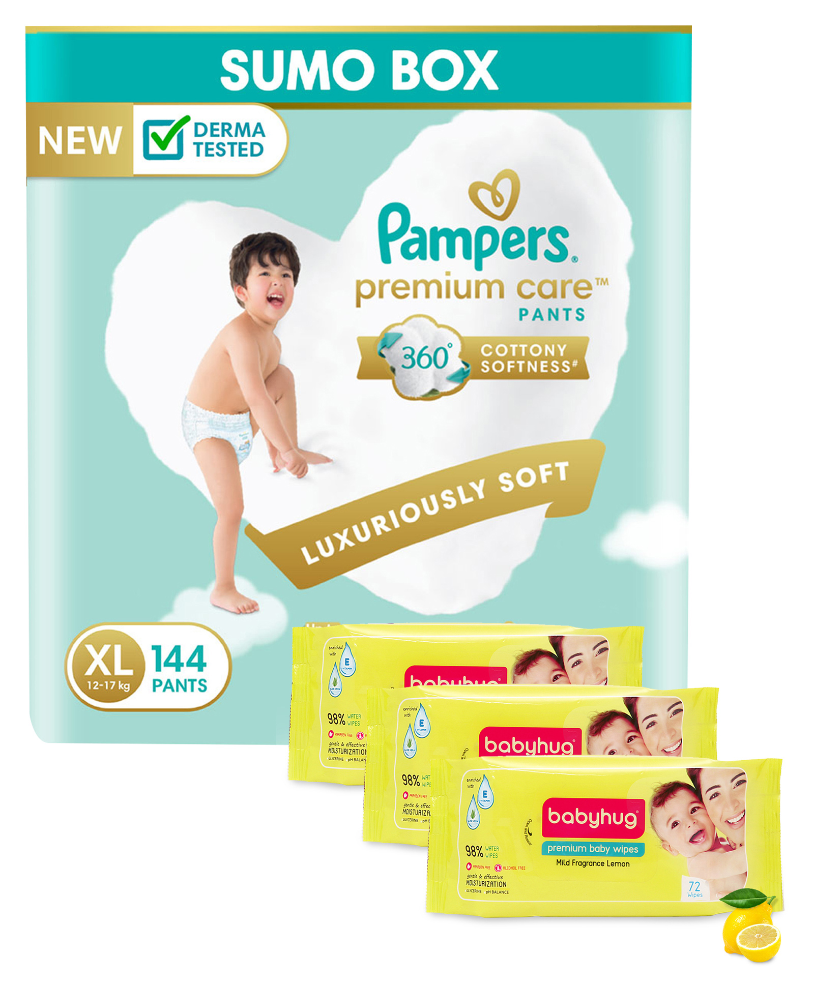 Pampers Premium Care Pants Baby Diapers Extra Large - 144 Pieces & Babyhug Premium Baby Lemon Wipes - 72 Pieces - (Pack of 3)