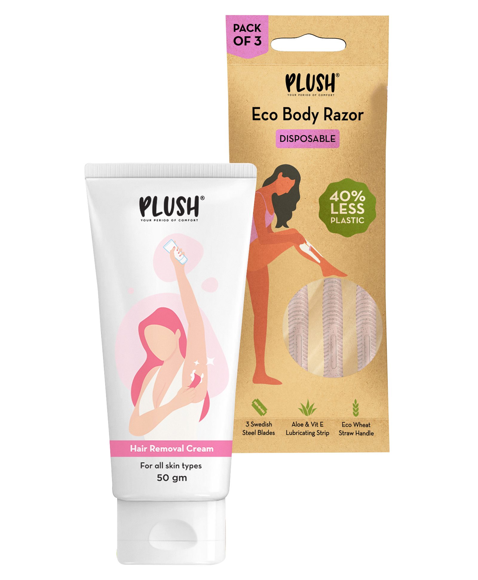 Plush Eco Razor Disposable Pack of 3- Pink 5 & Plush Hair Removal Cream- 50 g
