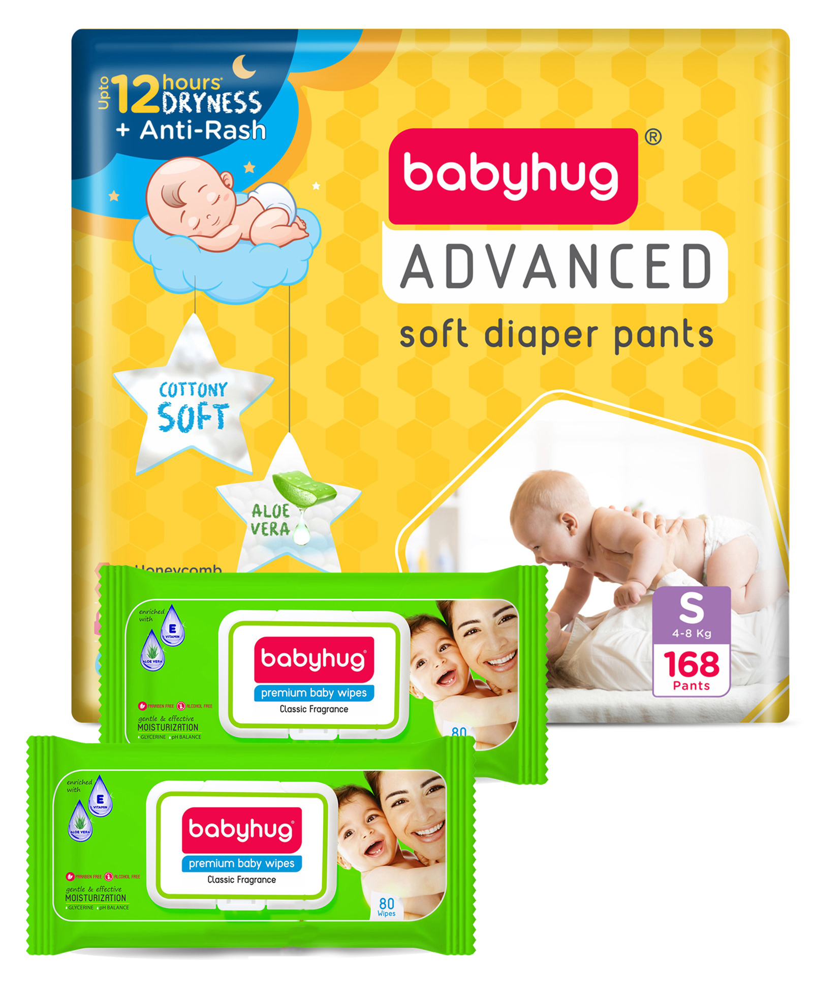 Babyhug Advanced Pant Style Diaper Monthly Box Pack Small (S) Size - 168 Pieces, Honeycomb Technology, Cottony Soft Diaper with 3D Leak Guard, Latex & Alcohol Free, Anti-rash & Gentle