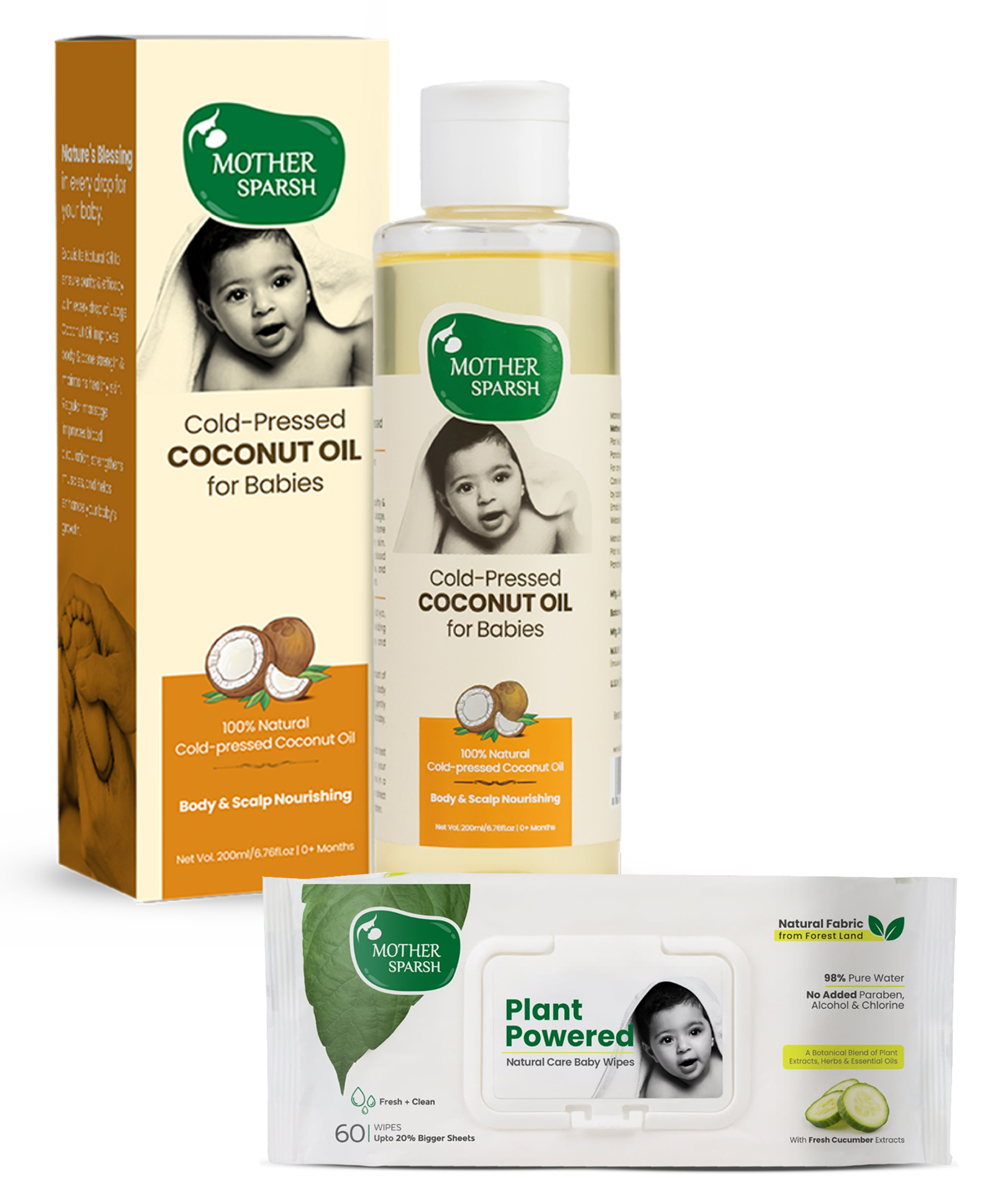 Mother Sparsh Baby Cold Pressed Coconut Oil - 200 ml & Mother Sparsh Baby Plant Powered Natural Baby Wipes With Cucumber Extract - 60 Pieces