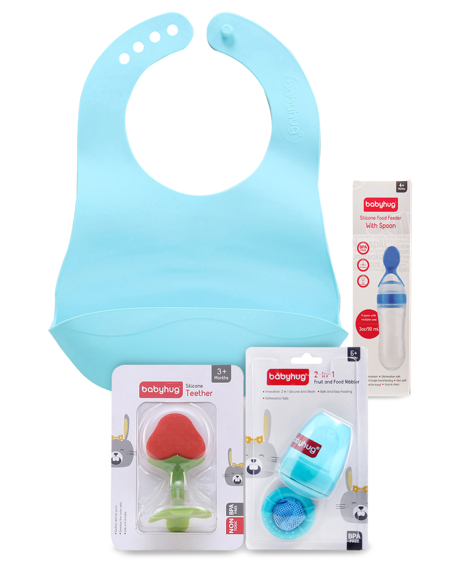 Babyhug Baby Silicon Combo Of Fruit Nibbler Food Feeder Fruit Teether & Bib Pack Of 4