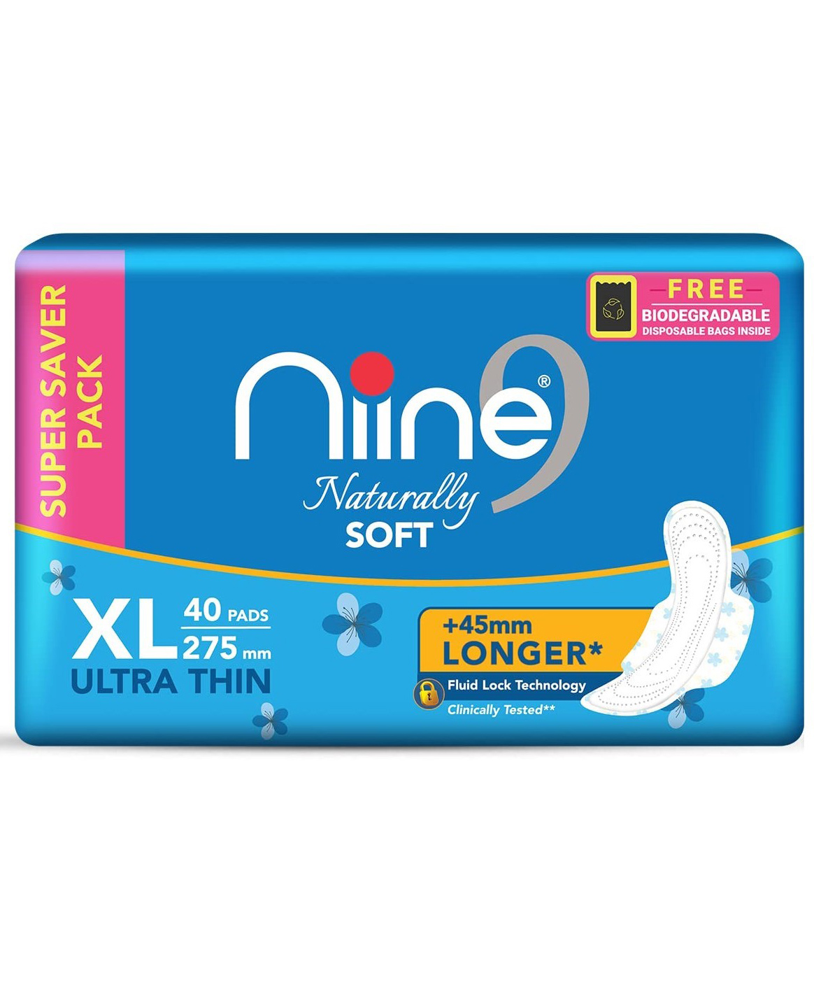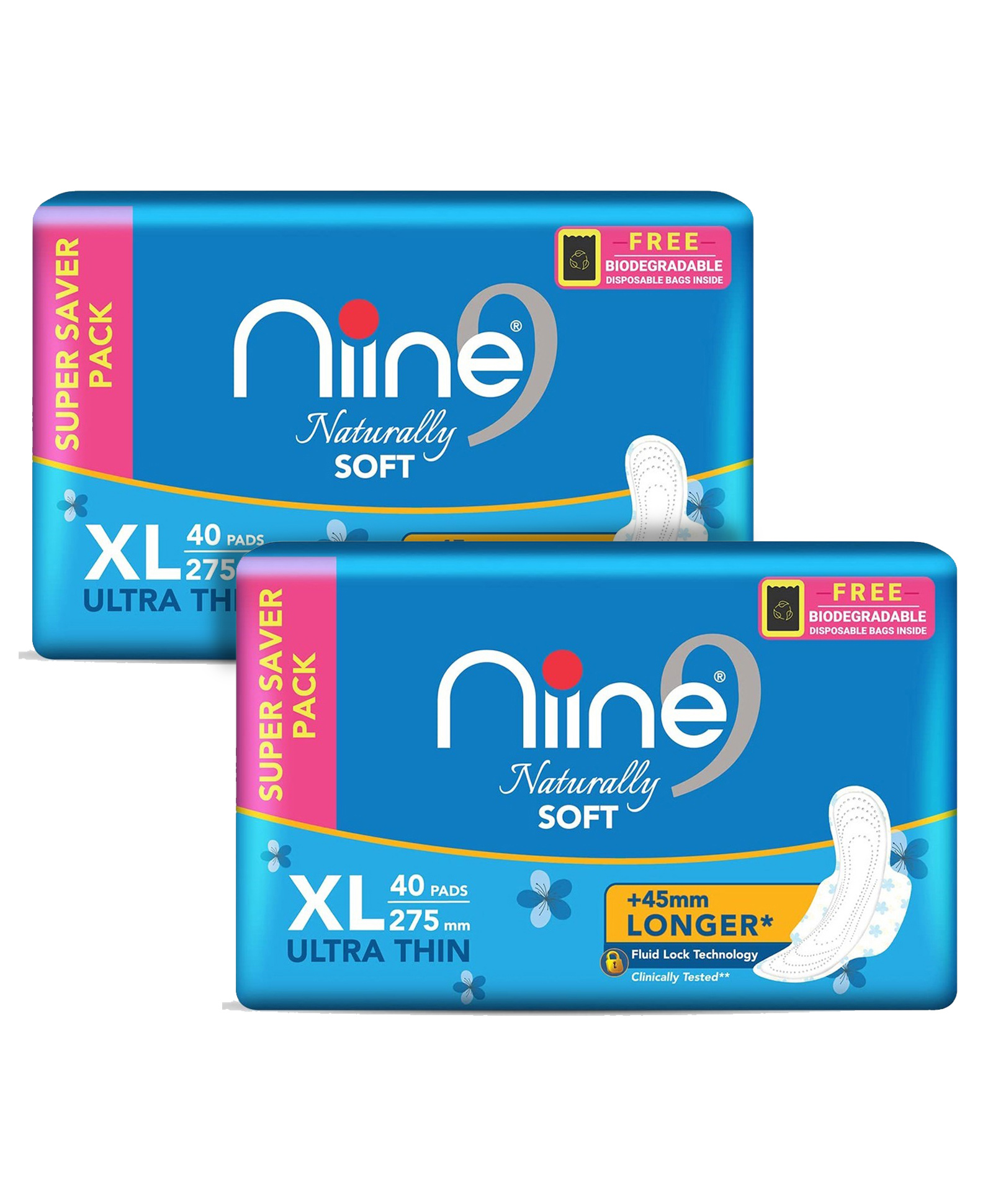 Niine Naturally Soft Ultra Thin XL Sanitary Pads with Free Biodegradable Disposal Bags - 40 Pads - (Pack of 2)