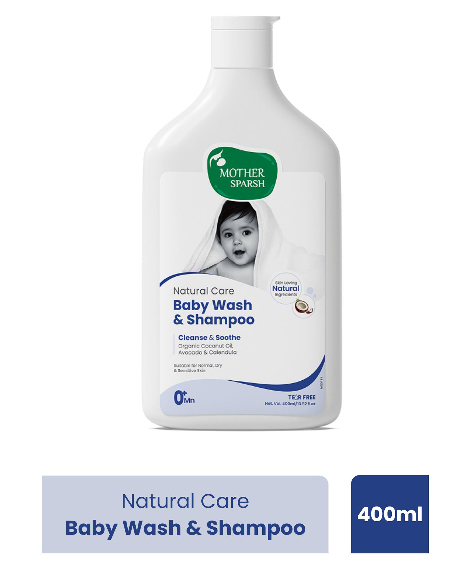 Mother Sparsh Natural Care Baby Wash & Shampoo | Baby Head to Toe Wash | Tear Free Formula With Organic Coconut Oil, Calendula & Avocado | Suitable for Newborn Sensitive Skin - 400 ml