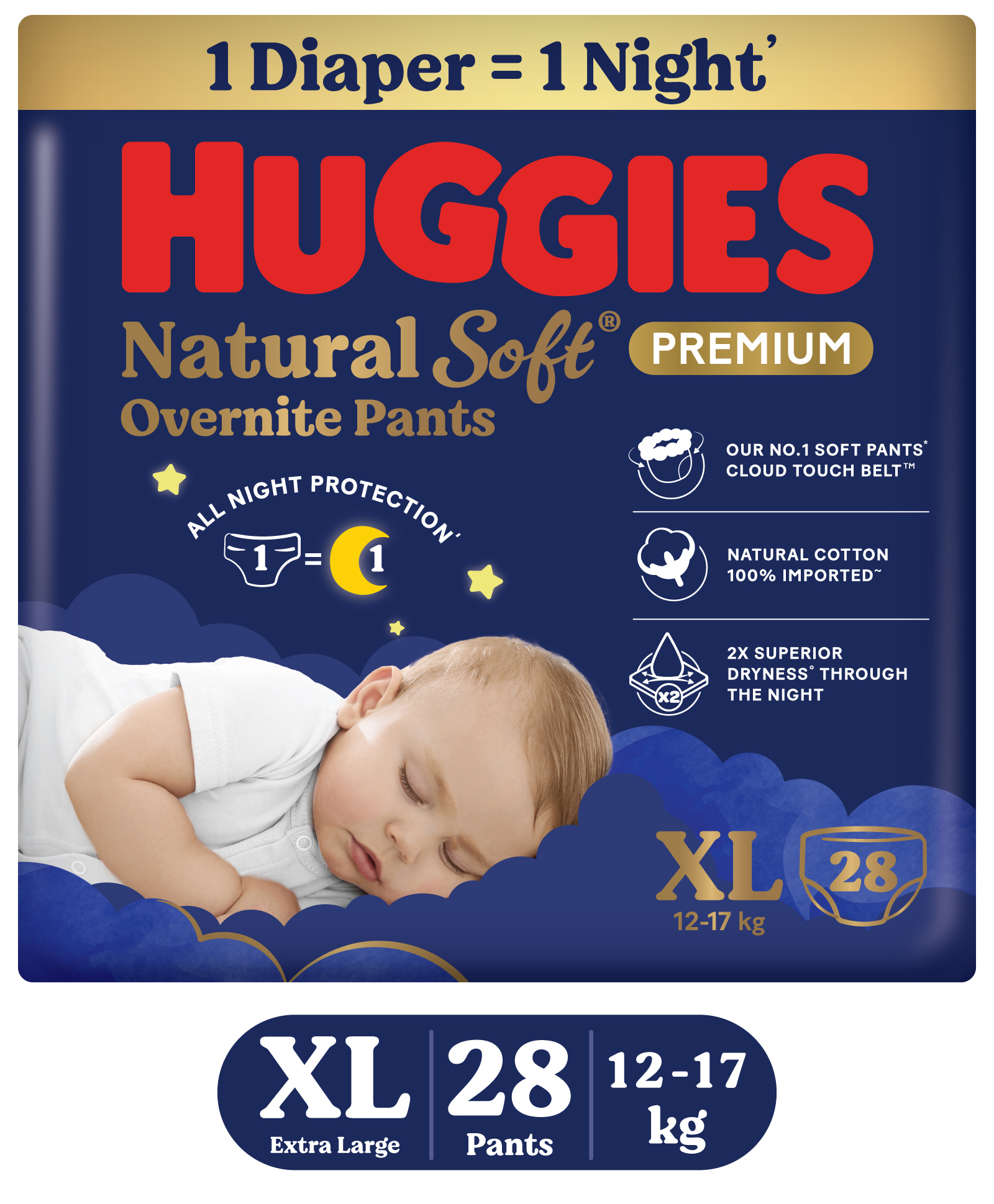 Huggies Natural Soft Overnite Diaper Pants| Premium Pant Style Baby Diapers Extra Large Size (XL Size | 12-17 Kgs) , 28 count| Keeps baby dry all night with cloud softness all over