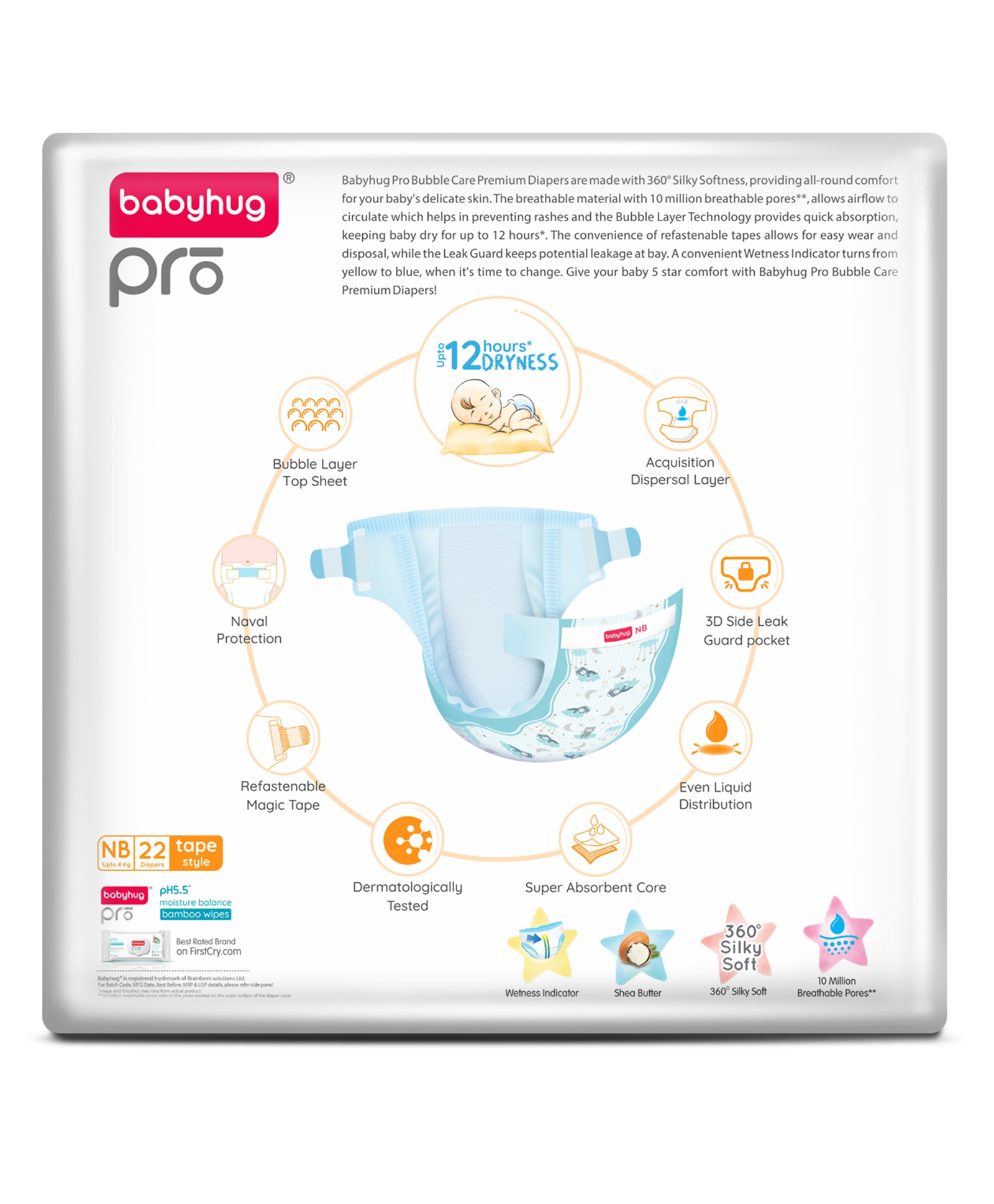 BabyhugPro Bubble Care Premium Tape Style Diaper for New Born (NB) Size - 22 Pieces & BabyhugPro Sensitive pH 5.5 Peach Milk Shampoo - 100 ml