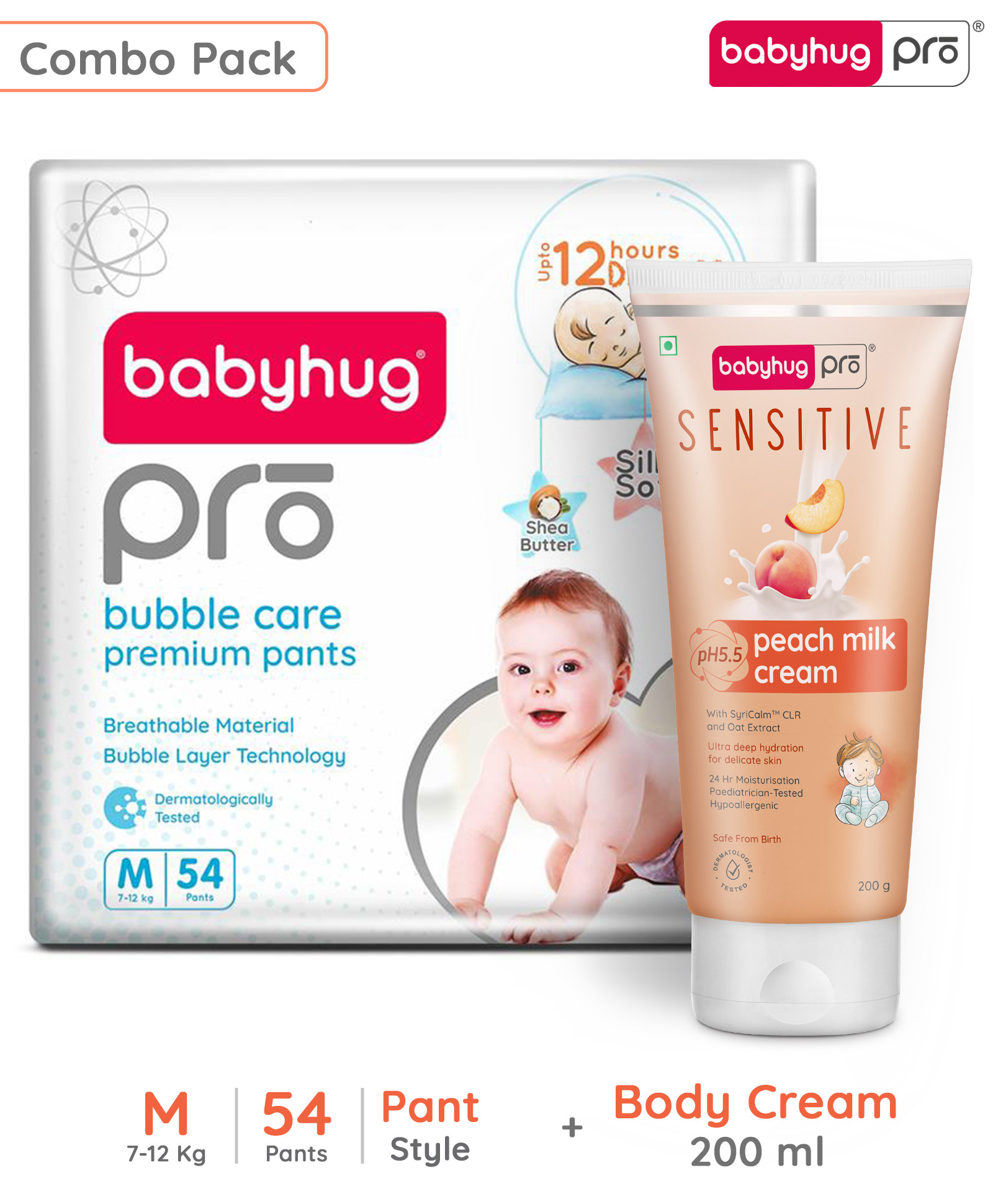 BabyhugPro Bubble Care Premium Pant Style Diaper Medium (M) Size - 54 Pieces & BabyhugPro Sensitive pH 5.5 Peach Milk Cream - 200 g