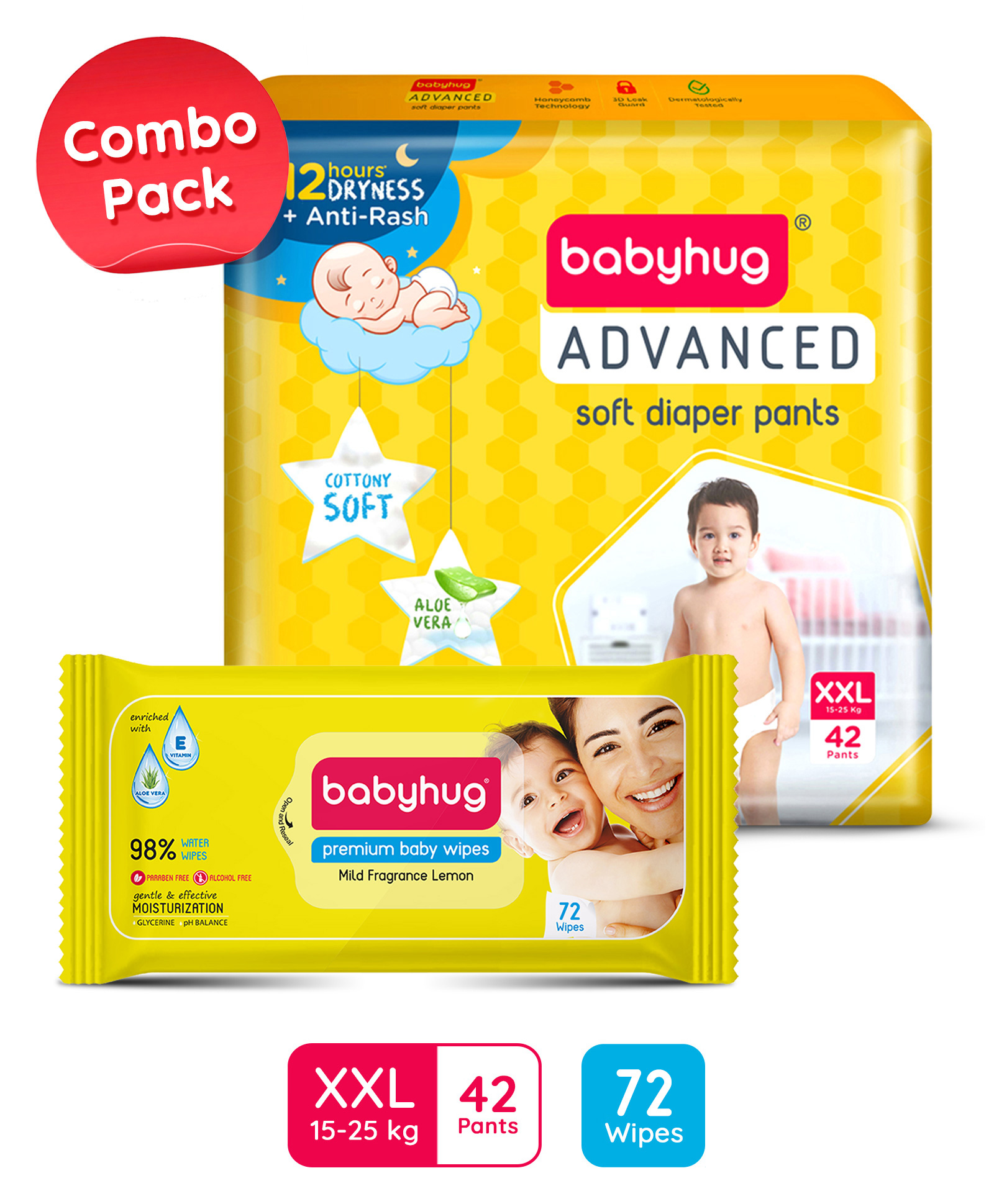 BabyhugAdvanced Pant Style Diapers (XXL) - 42 Pieces & BabyhugPremium 98% Water Baby Wet Wipes with Lemon Scent - 72 Pieces