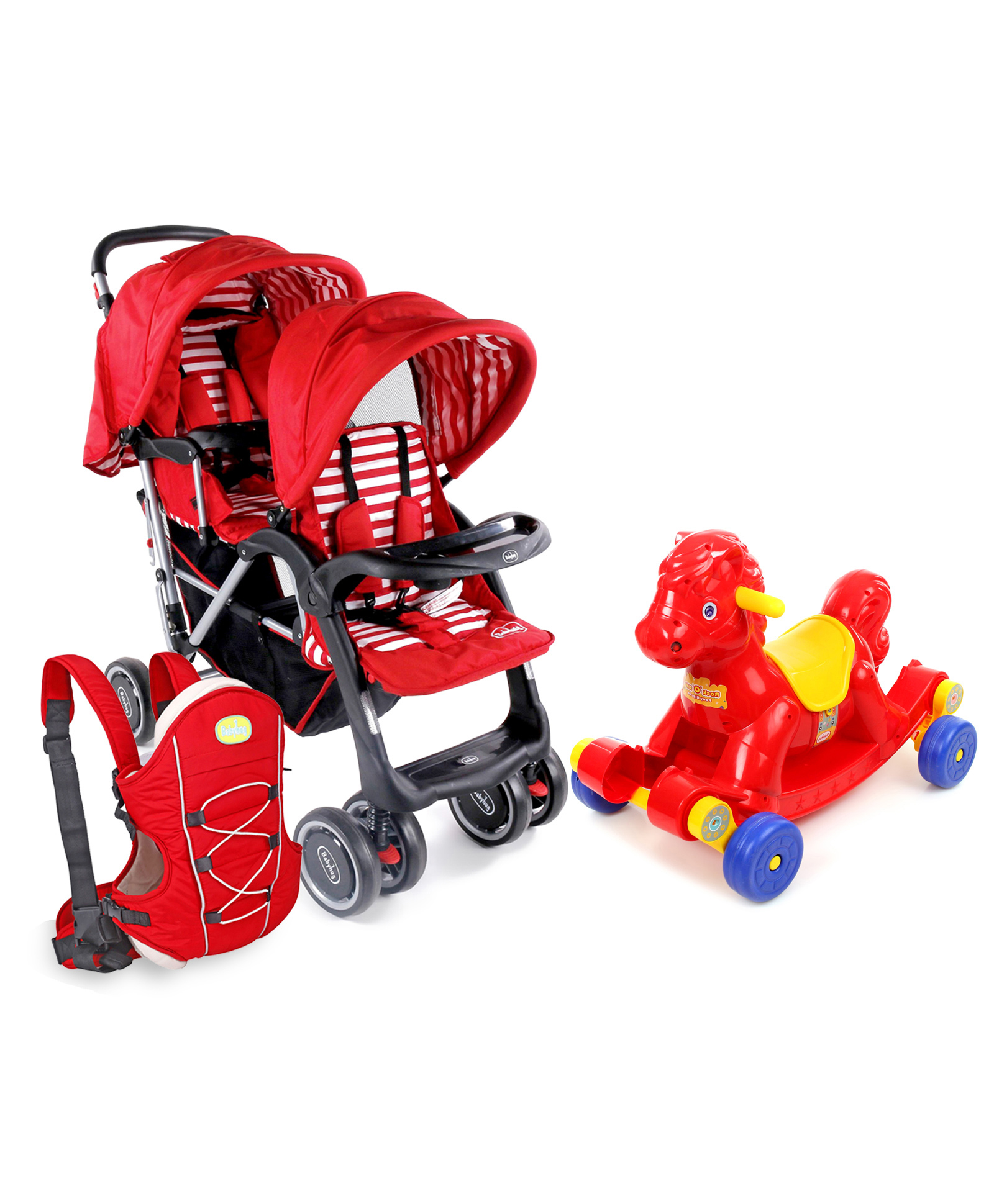 Babyhug Cuddle Up 3 Way Baby Carrier - Red AND Babyhug Twinster Stroller - Red AND Babyhug Rock O Ride Pony Ride-on - Red