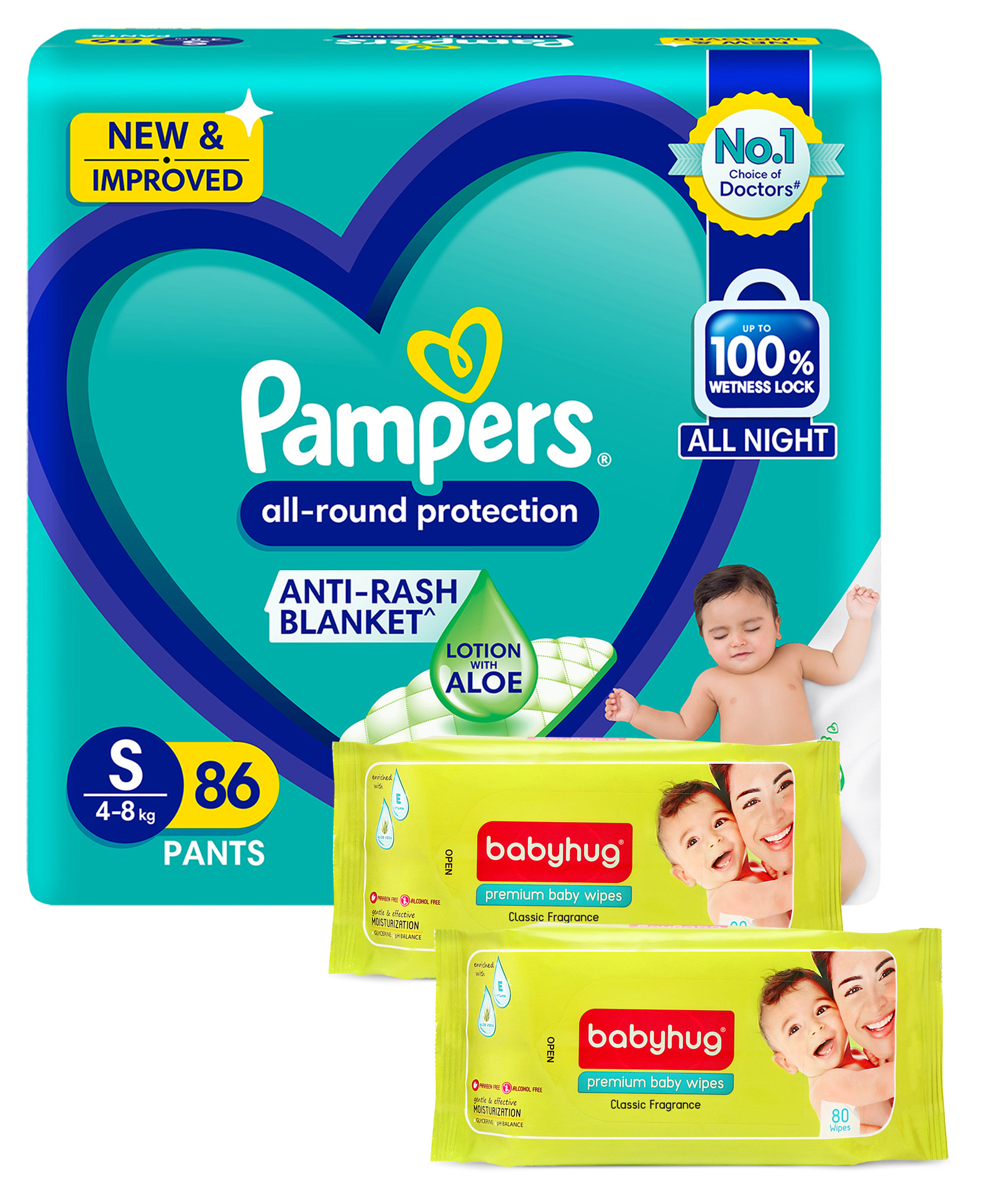 Pampers Pant Style Diapers Small - 86 Pieces & Babyhug Premium Baby Wipes - 80 Pieces (Pack of 2)