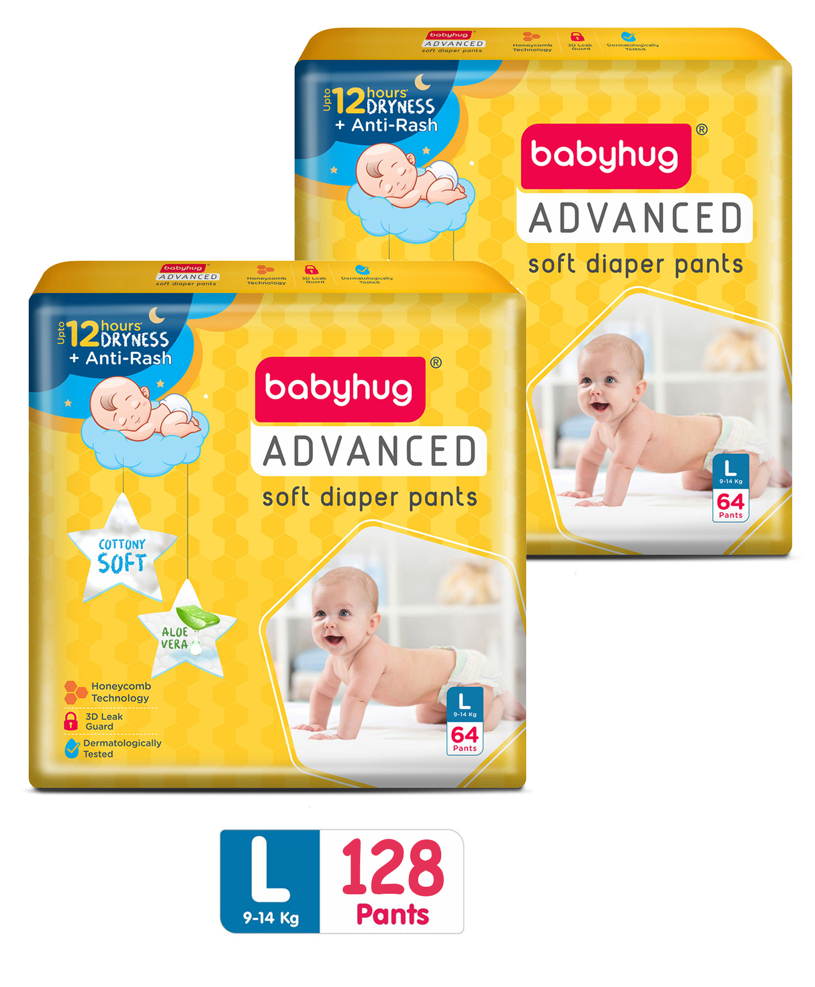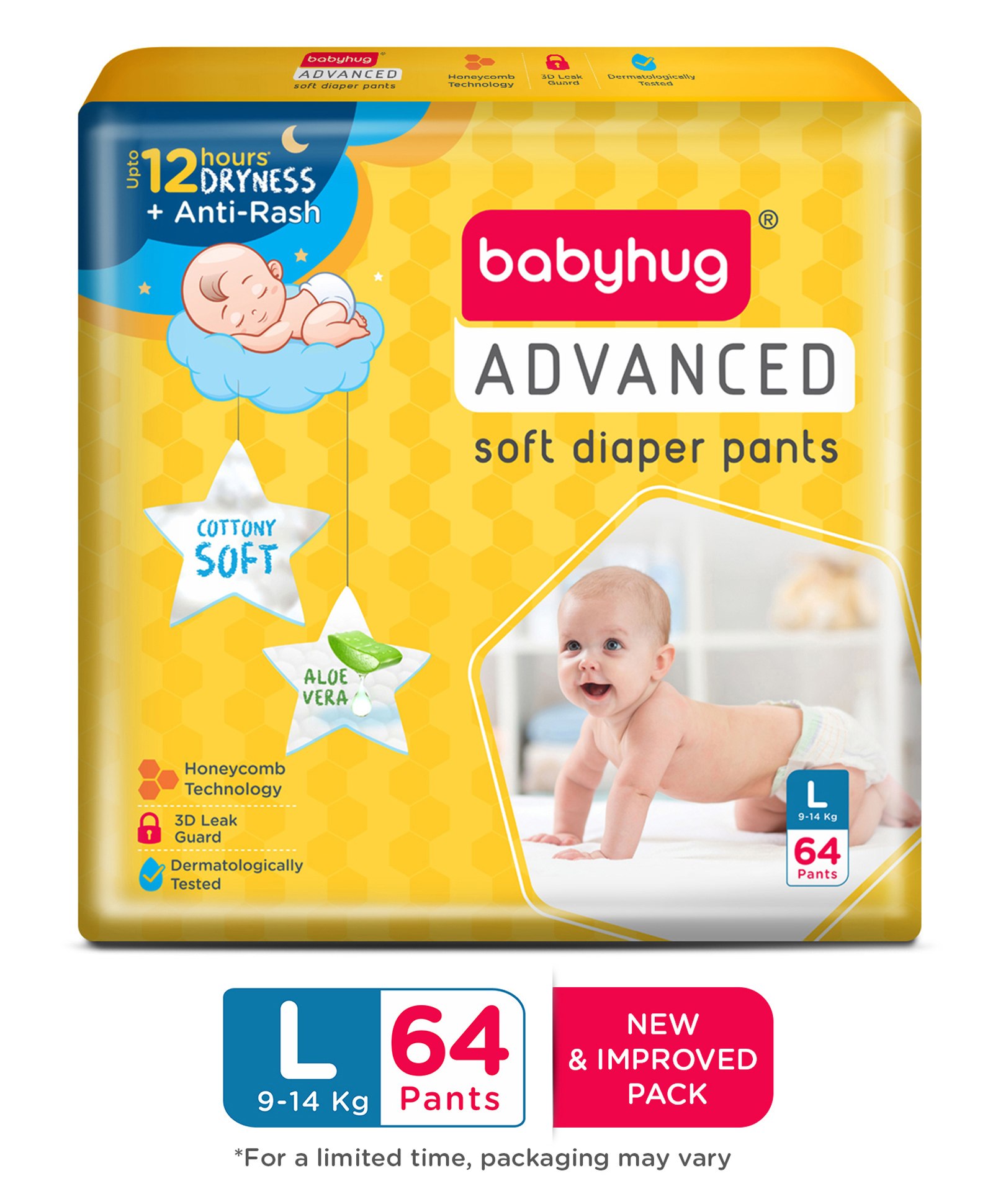 Babyhug Advanced Pant Style Diapers Large (L) Size - 64 Pieces, Honeycomb Technology, Cottony Soft Diaper with 3D Leak Guard, Latex & Alcohol Free, Anti-rash & Gentle