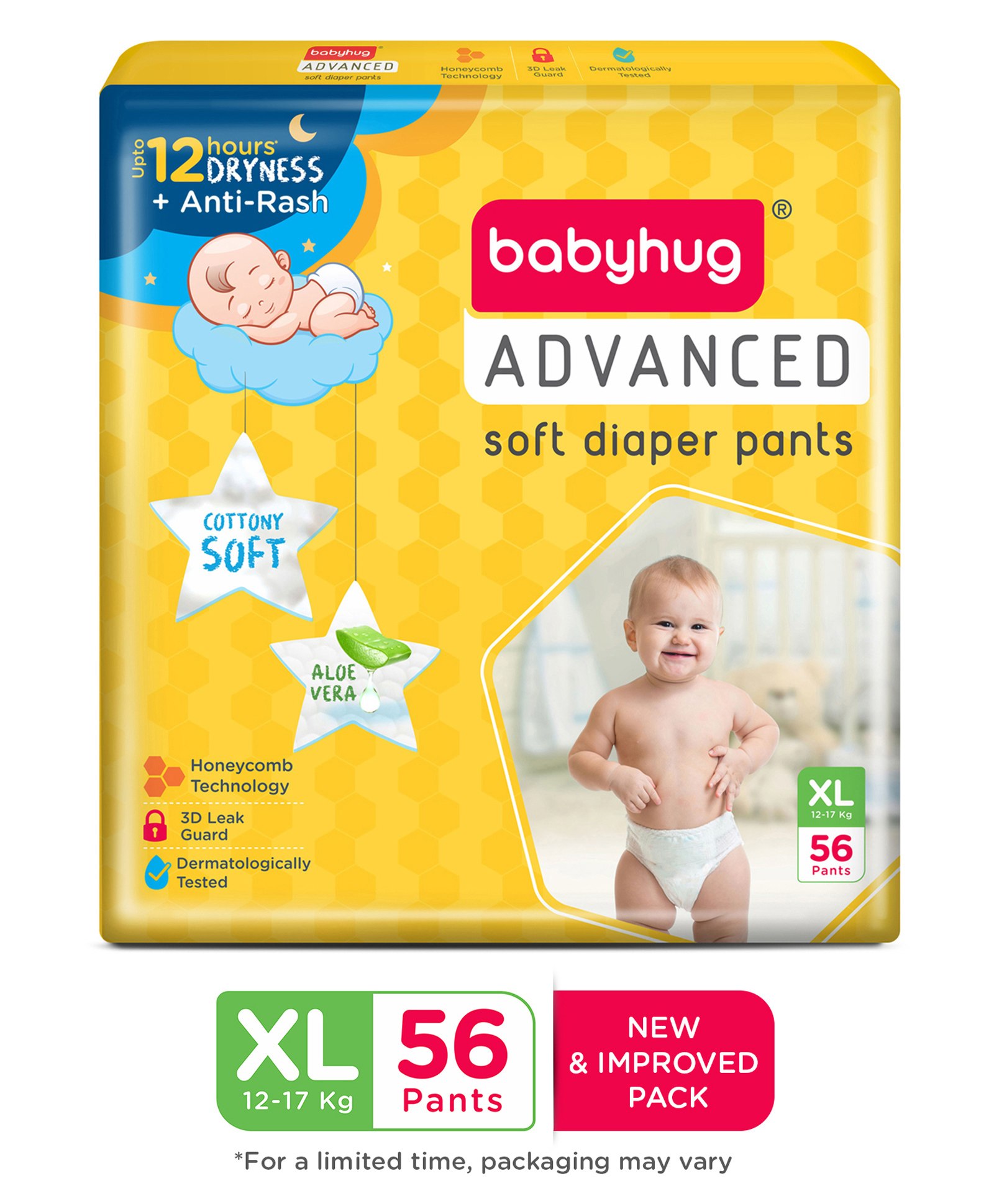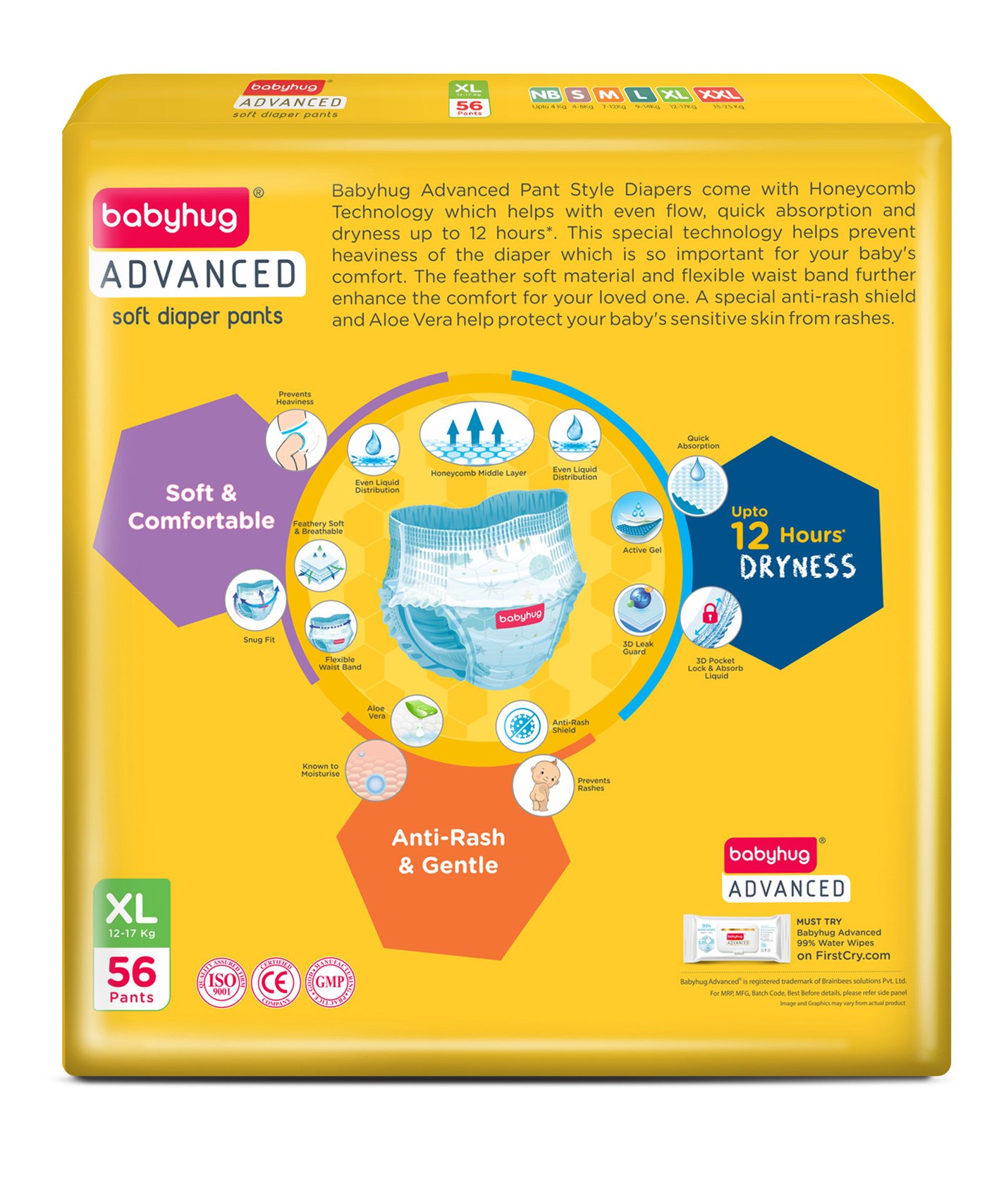 Babyhug Advanced Pant Style Diapers Extra Large (XL) Size - 56 Pieces, Honeycomb Technology, Cottony Soft Diaper with 3D Leak Guard, Latex & Alcohol Free, Anti-rash & Gentle
