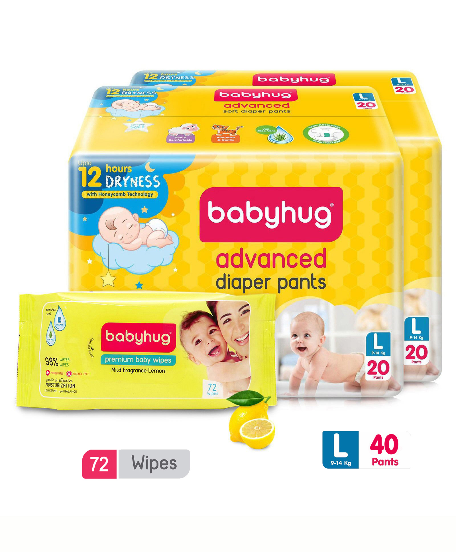 Babyhug Advanced Pant Style Diapers Large - 20 Pieces Pack of 2 with Babyhug Premium Baby Lemon Wipes - 72 Pieces