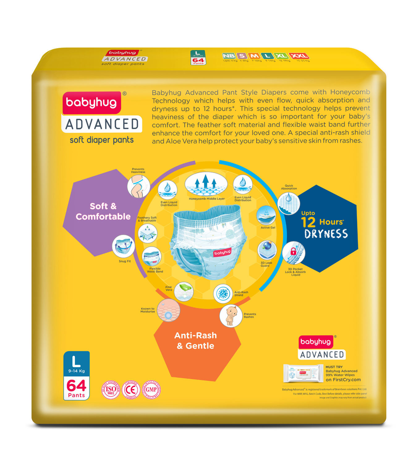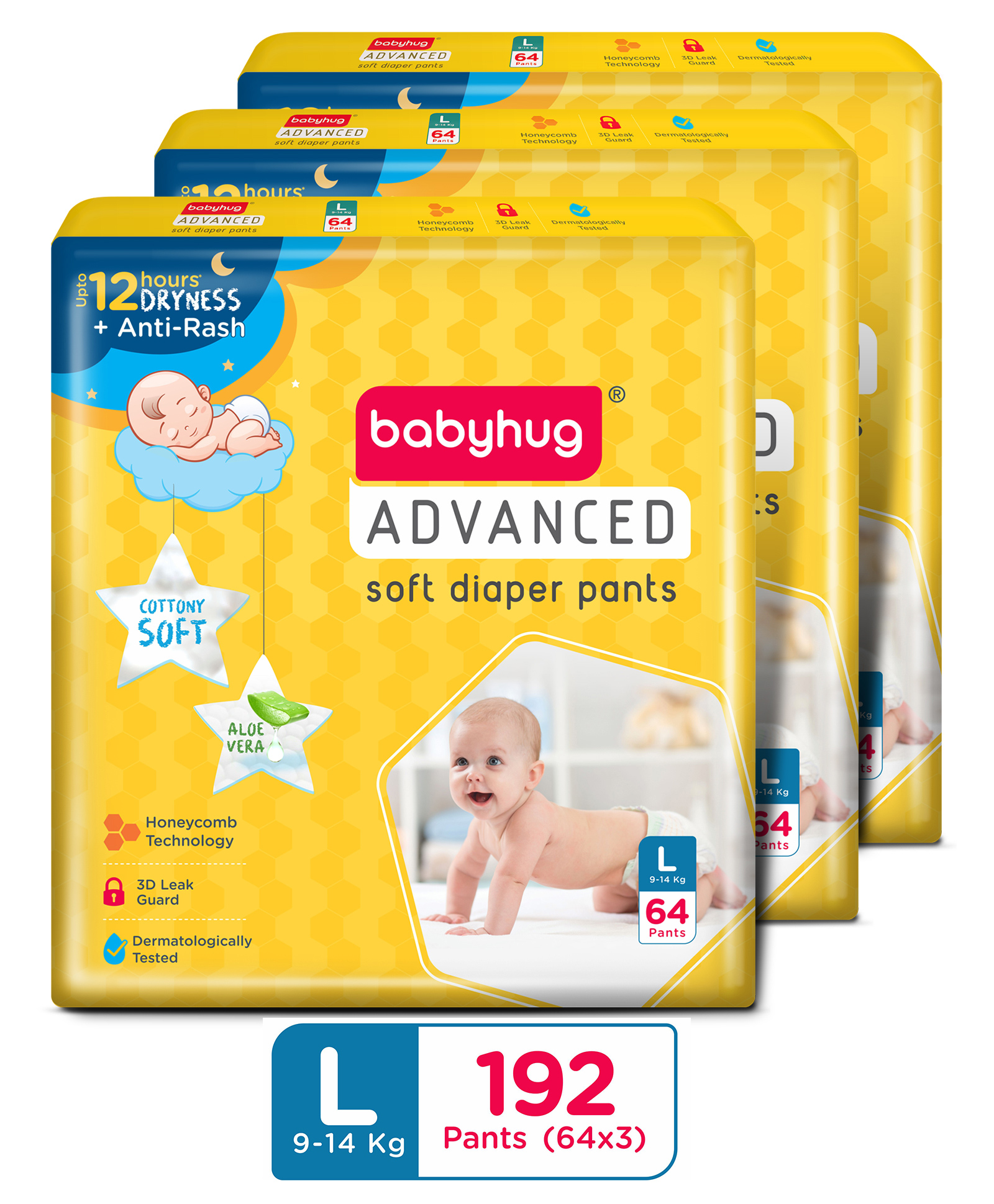 Babyhug Advanced Pant Style Diapers Large (L) Size - 64 Pieces, Honeycomb Technology, Cottony Soft Diaper with 3D Leak Guard, Latex & Alcohol Free, Anti-rash & Gentle