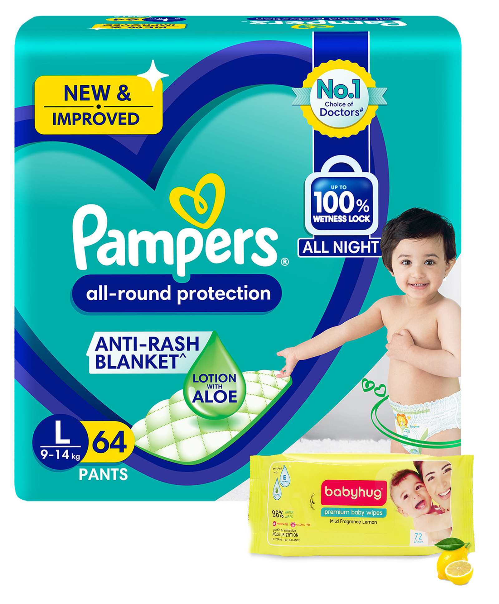 Pampers Pant Style Diapers Large - 64 Pieces & Babyhug Premium Baby Lemon Wipes - 72 Pieces (Pack of 2 )