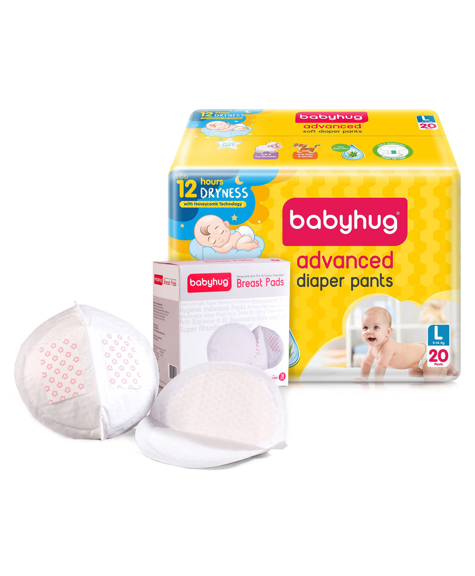 Babyhug 3D Contoured Disposable Breast Pads - Pack of 36 & Pant Style Diapers Large Combo Pack