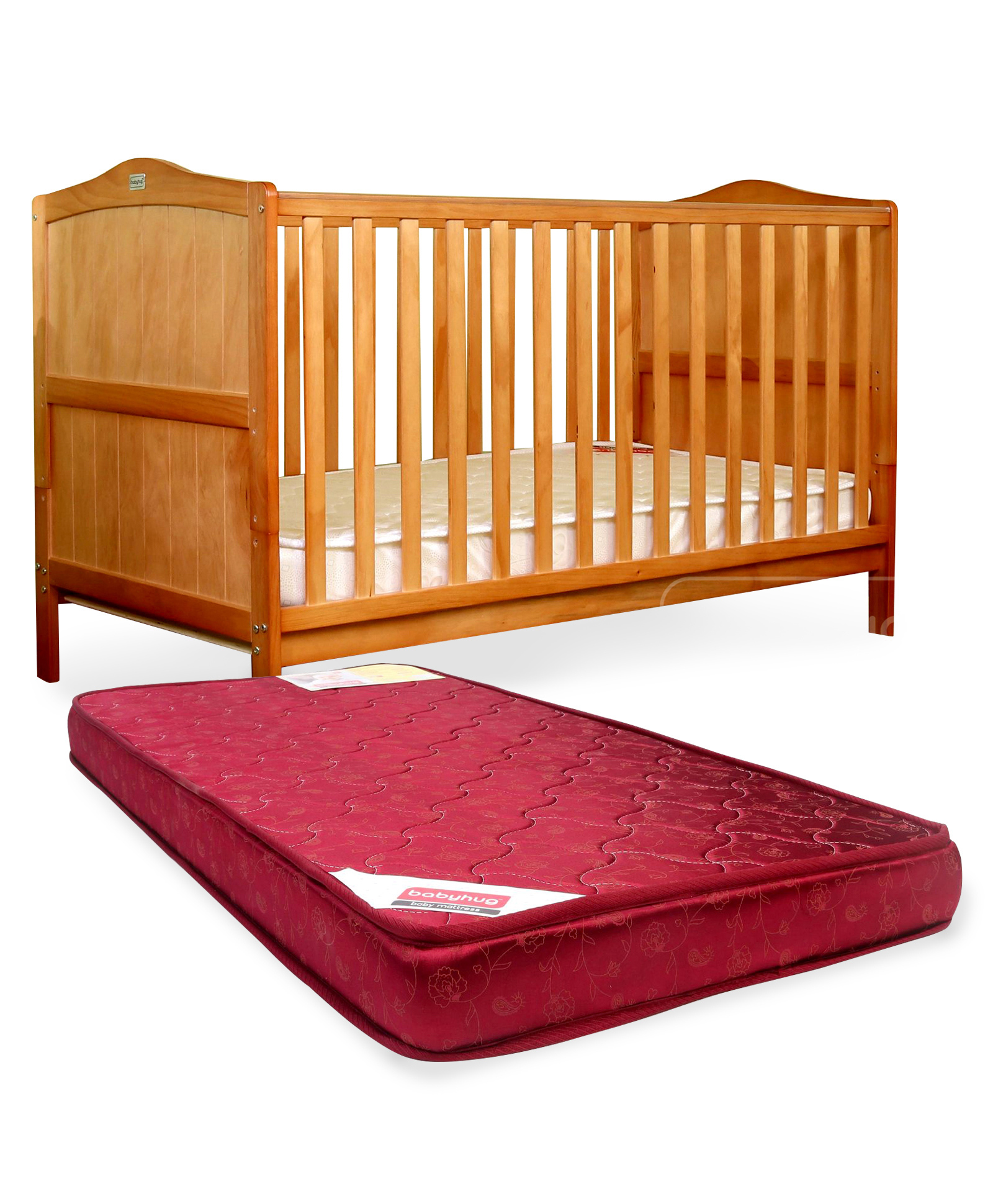 Babyhug 2 in 1 Height Adjustable Merlino Wooden Cot Cum Bed - Antique AND Babyhug Baby Mattress Maroon (Design May Vary)