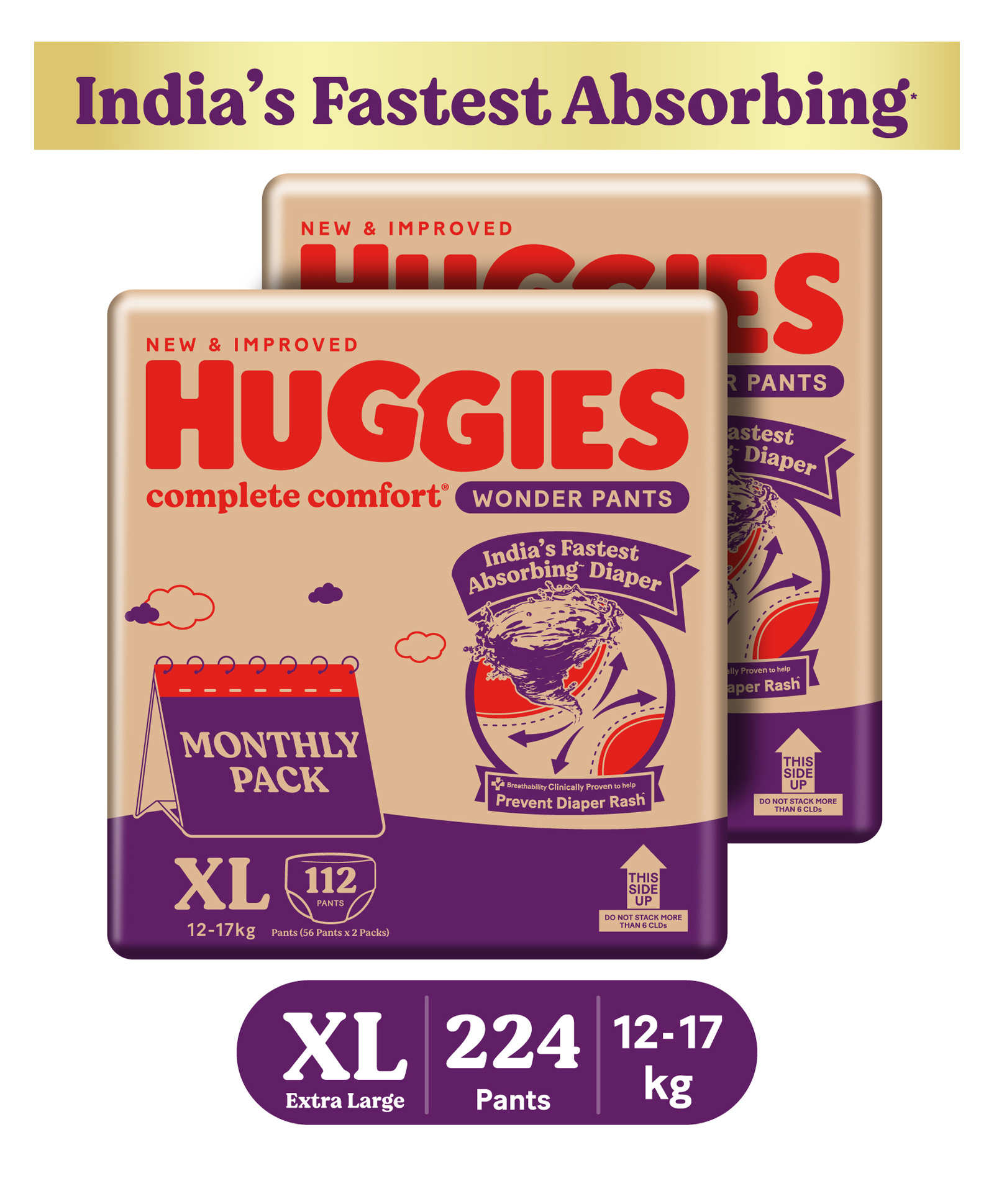 Huggies Complete Comfort Wonder Pants, India's Fastest Absorbing Diaper | XL Size, 112 Diapers